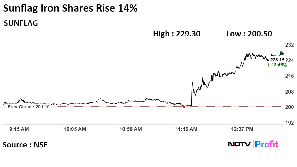 On the NSE, Sunflag Iron's stock rose as much as 14.12% during the day to Rs 229.50 apiece, the highest since Aug. 10. It was trading 10.82% higher at Rs 222.85 apiece compared to a 0.77% advance in the benchmark Nifty 50 at 1.58 p.m.