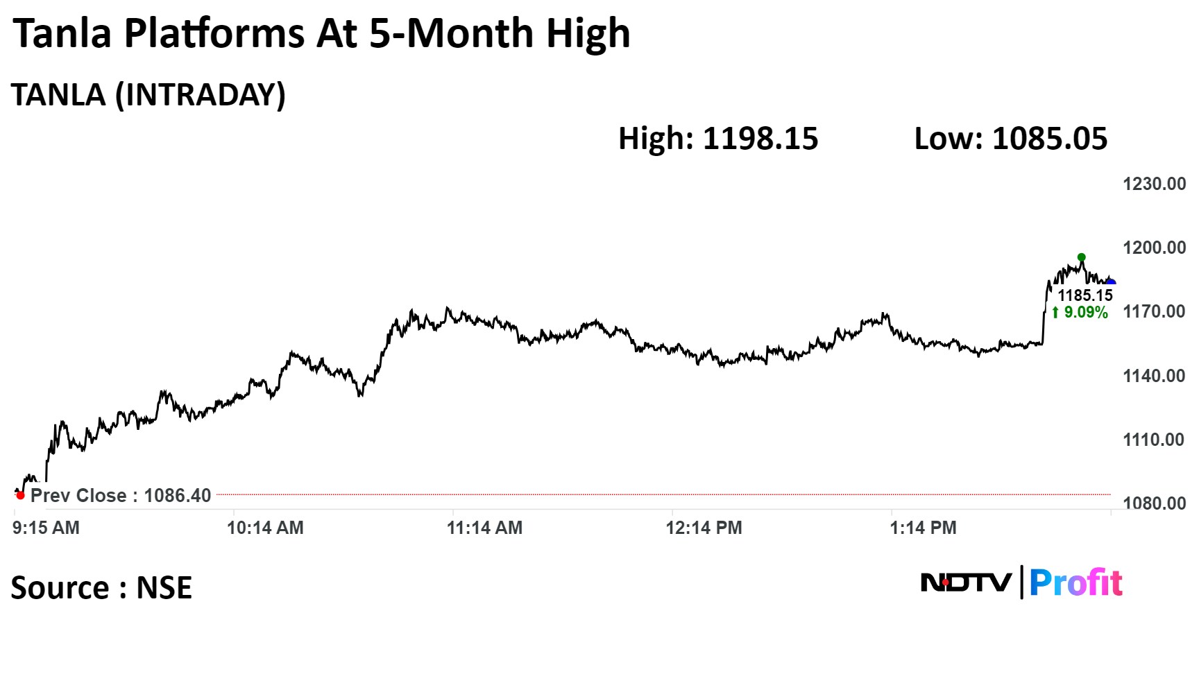 Shares of Tanla Platforms Ltd. rose over 10% to a five-month high after entering into its first commercial agreement with an Indian bank for its anti-phishing platform Wisely ATP.