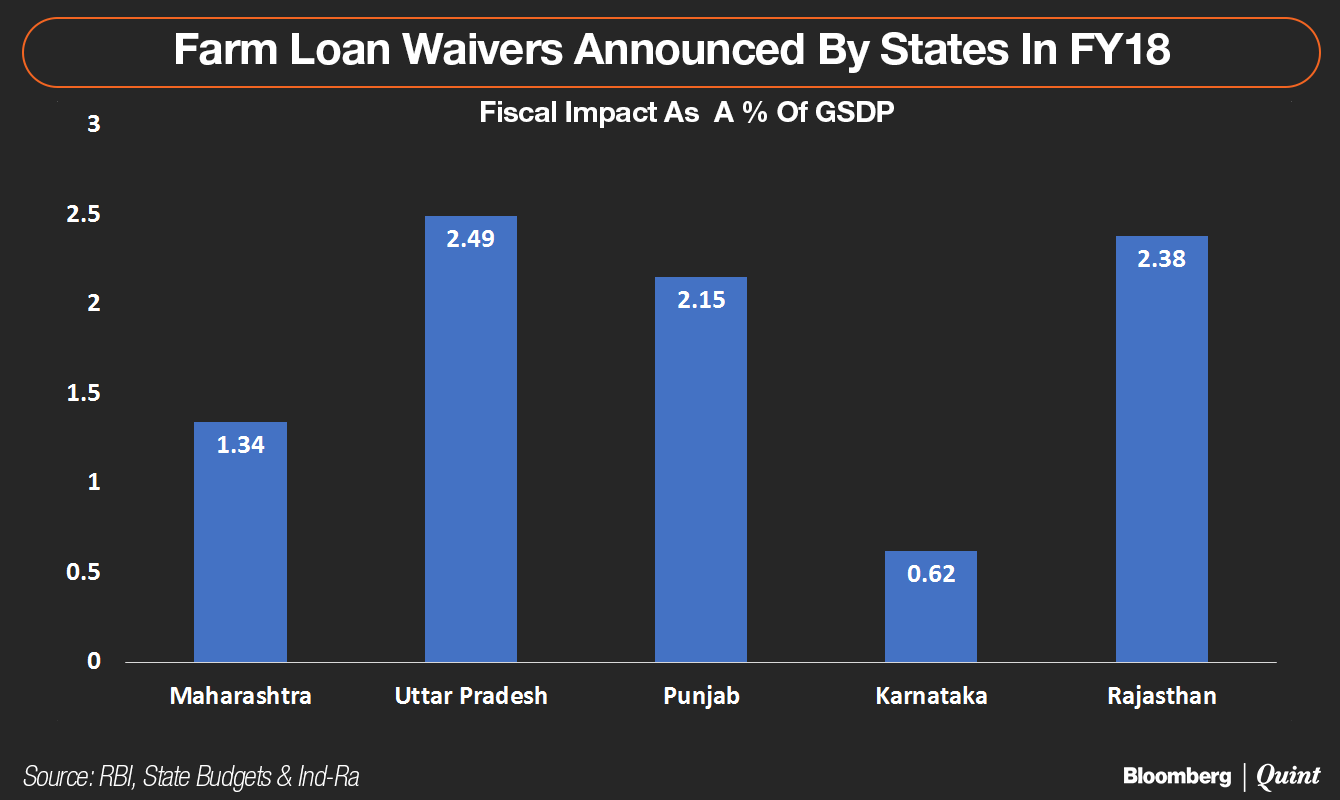 Farm debt waivers announced by five states together are likely to widen the combined fiscal deficit of states by Rs 1.07 lakh crore or 0.65 percent of the of GDP, according to India Ratings estimates. Of these, waivers announced by Maharashtra, Karnataka and Rajasthan are outside their state budgets, forcing them to divert funds from their original capex plans.
