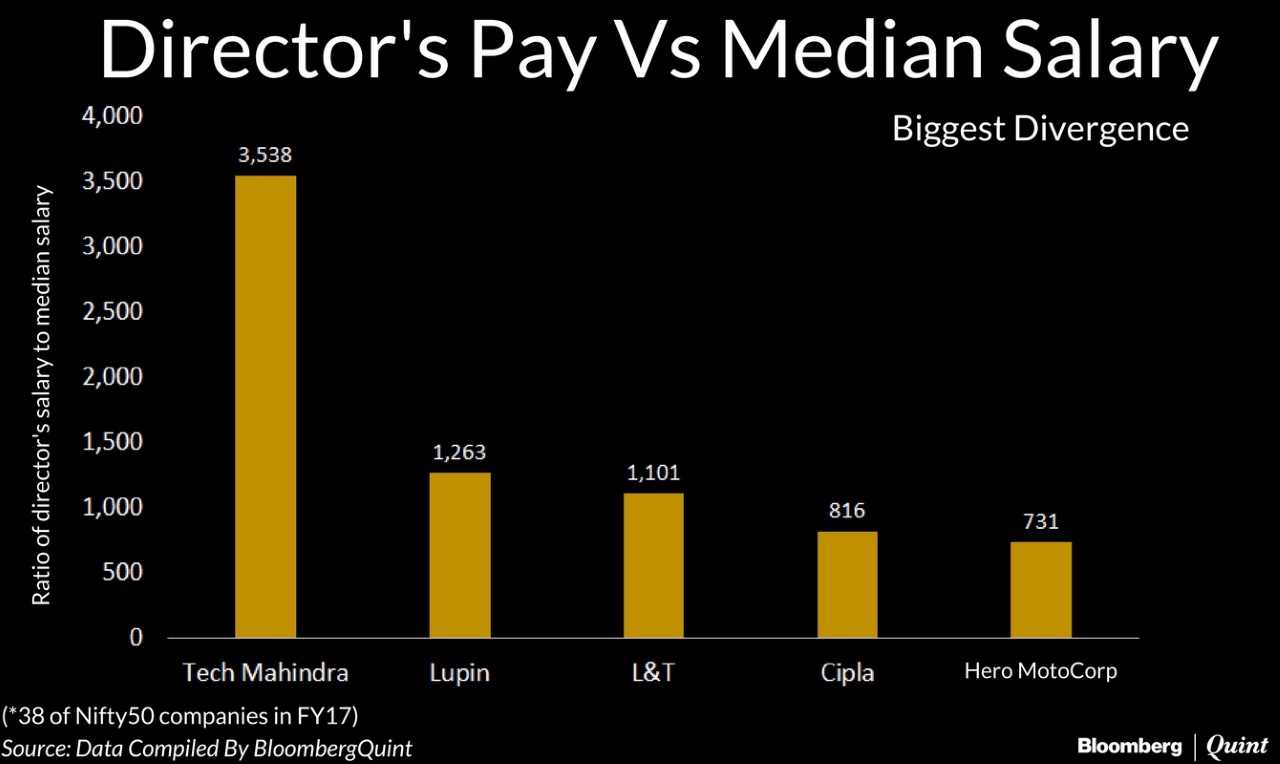 - CP Gurnani, managing director and chief executive officer of Tech Mahindra tops the list. His take-home pay for the financial year 2016-17 was 3,538 times higher than the median salary of an employee in Tech Mahindra, data compiled by BloombergQuint shows. This was a big jump from FY16 when his salary was 867 times the median pay.