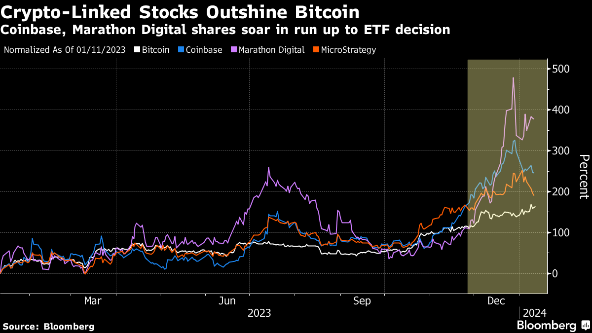 (Bloomberg) -- Stocks linked to cryptocurrencies received fresh impetus from the US financial regulator's approval for exchange-traded funds that invest directly in Bitcoin, extending their gravity-defying gains of the past year.