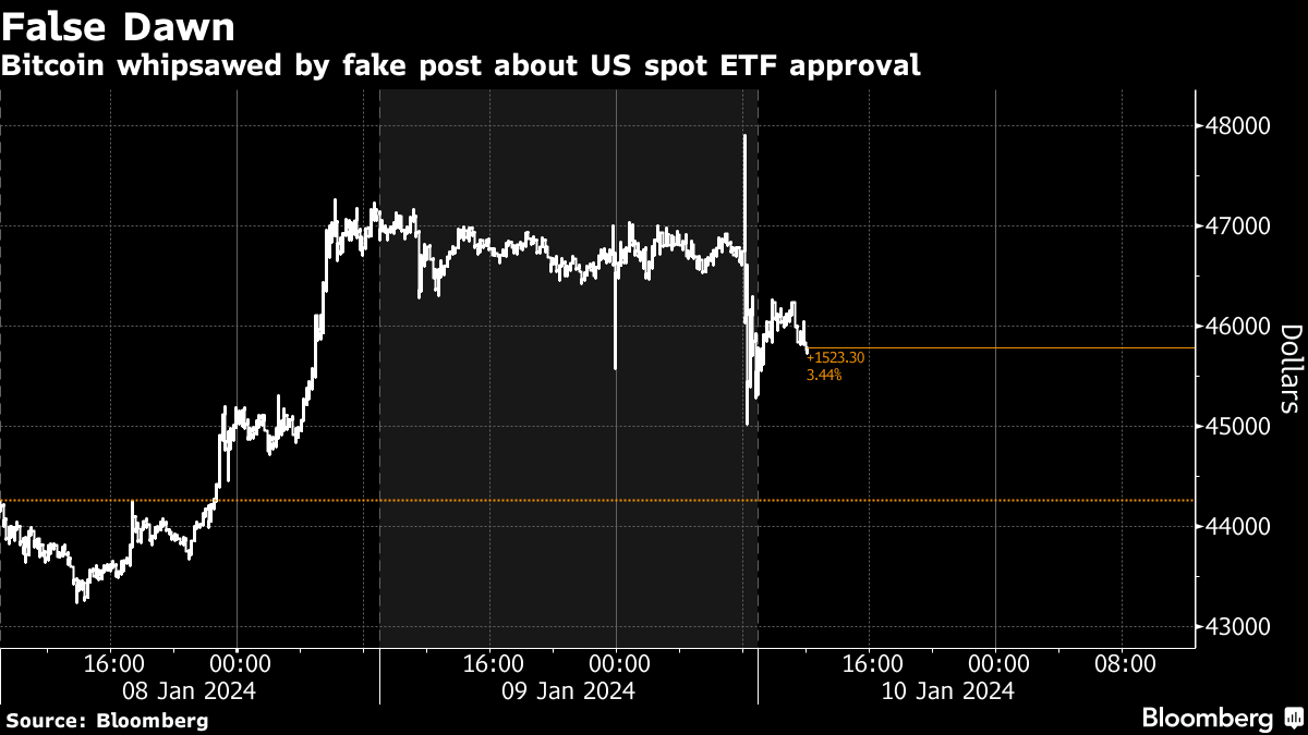 (Bloomberg) -- Bitcoin dropped to around $45,000 before paring losses after a false post on the US Securities and Exchange Commission's X account claimed that the agency had approved the issuance of ETFs holding the digital asset.