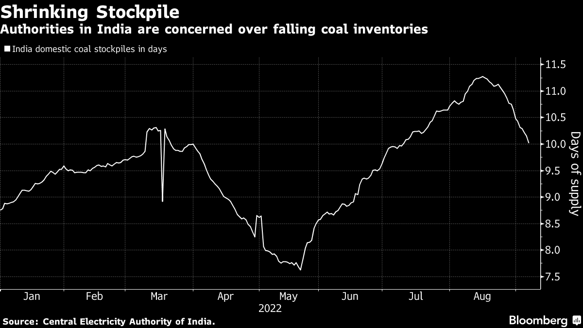 Stockpiles of the fossil fuel at power plants have fallen about 11% since mid-August, meaning utilities have an average of 10 days supply, well below required levels of more than three weeks. Coal helps produce about 70% of India's electricity.