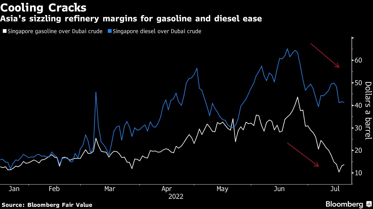 International crude prices have slumped since mid-June on concerns about a potential global recession, at one point erasing all the gains that followed Russia's invasion of Ukraine. Returns from processing gasoline and diesel in Asia have plunged in recent weeks, with industry consultant FGE expecting a further decline in margins this quarter due to increased supplies.