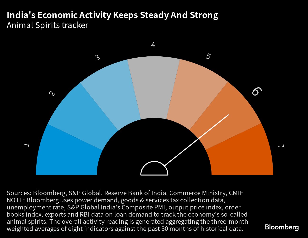 The needle on a dial measuring the so-called Animal Spirits stayed at six for a second month even as some indicators such as exports and tax collections showed signs of weakness. While four of the eight high-frequency indicators compiled by Bloomberg showed improvement, three worsened slightly and one was little changed.
