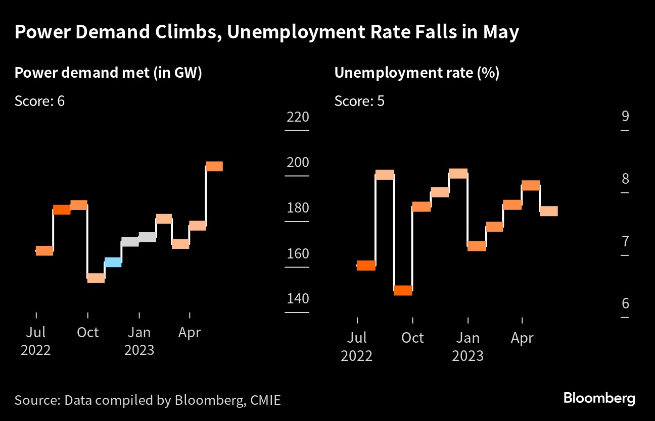 Electricity consumption, a widely used proxy to measure demand in industrial and manufacturing sectors, jumped from April as temperatures soared. Peak demand in May rose to 204 gigawatt from 178 at the end of April.