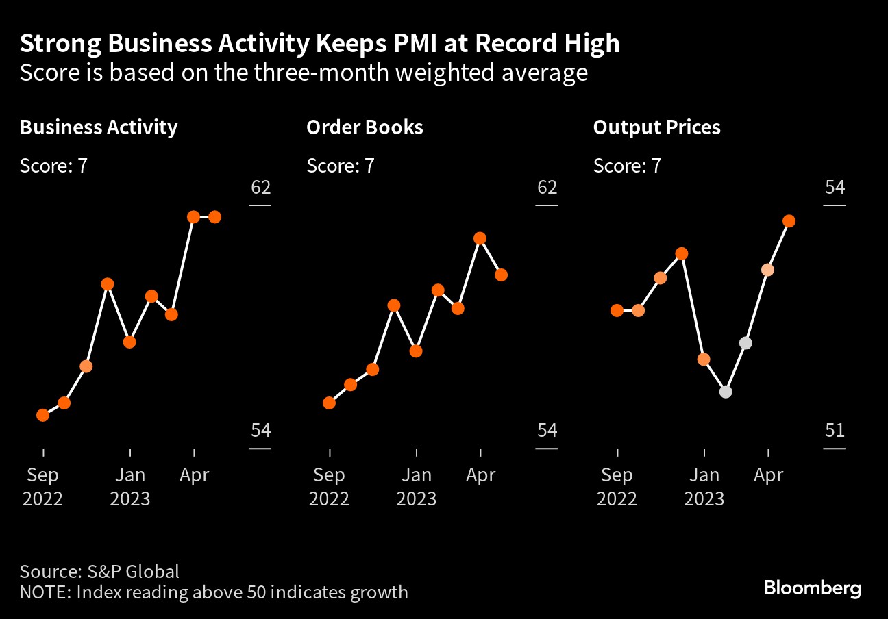 Purchasing managers' surveys showed manufacturing activity hit a 31-month high in May, “backed by record expansion in input stocks,” according to S&P Global Inc. Although services activity slowed from a near 13-year high in April, it was still faster than any other month and keeps the composite index at a high for a second straight month.