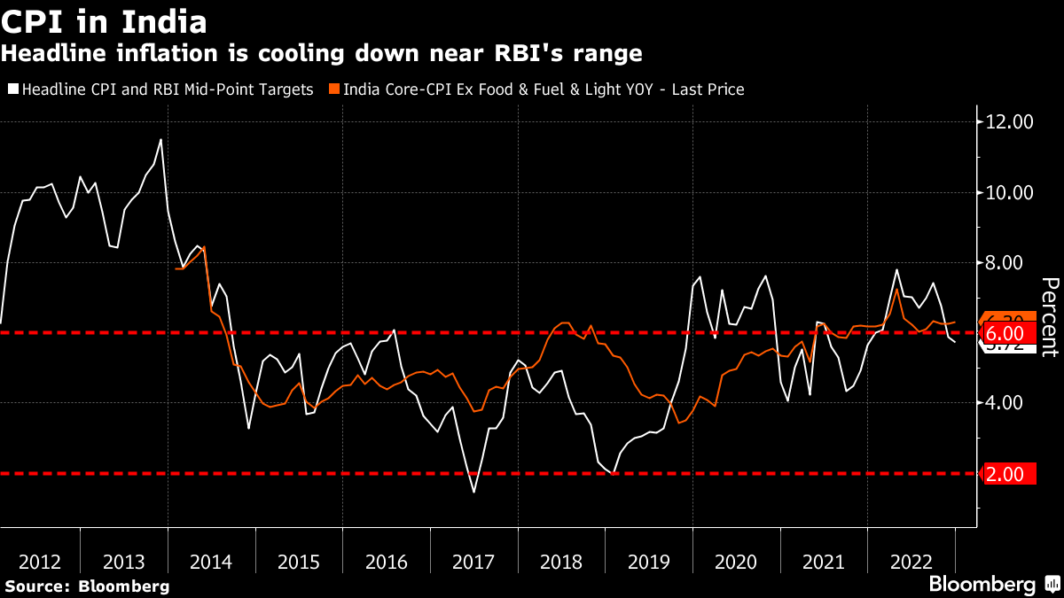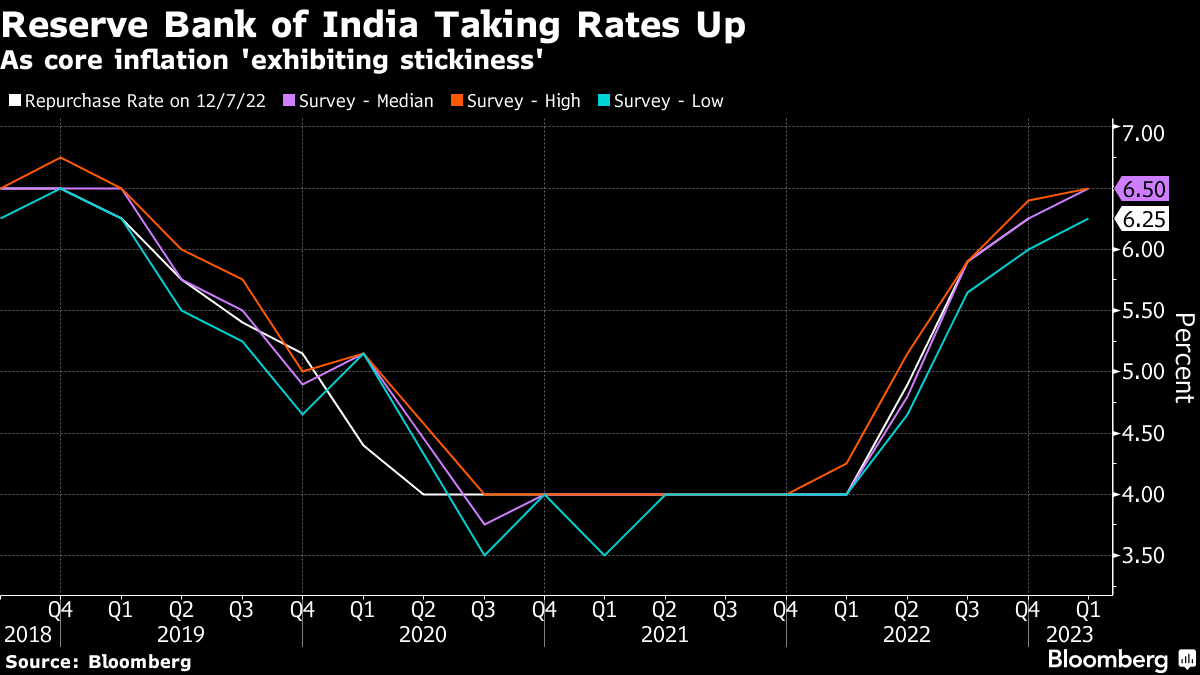 (Bloomberg) -- A weak currency and faltering stock market provide the backdrop for what's likely to be the Reserve Bank of India's final policy hike of this tightening cycle. The median forecast is for a 25 basis points increase in the repurchase rate to 6.5% on Wednesday, after RBI Governor Das pointed to sticky core inflation.