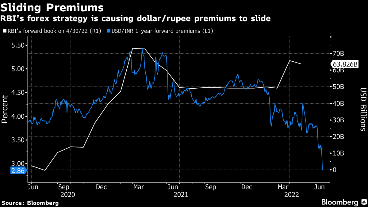 The move shows the central bank is pulling out all the stops to curb losses in the currency, which set a series of record lows this month and threatens to further accelerate inflation. The RBI's intervention strategy has caused dollar-rupee one-year annualized forward premiums to fall below 3% for the first time in a decade, according to Standard Chartered.
