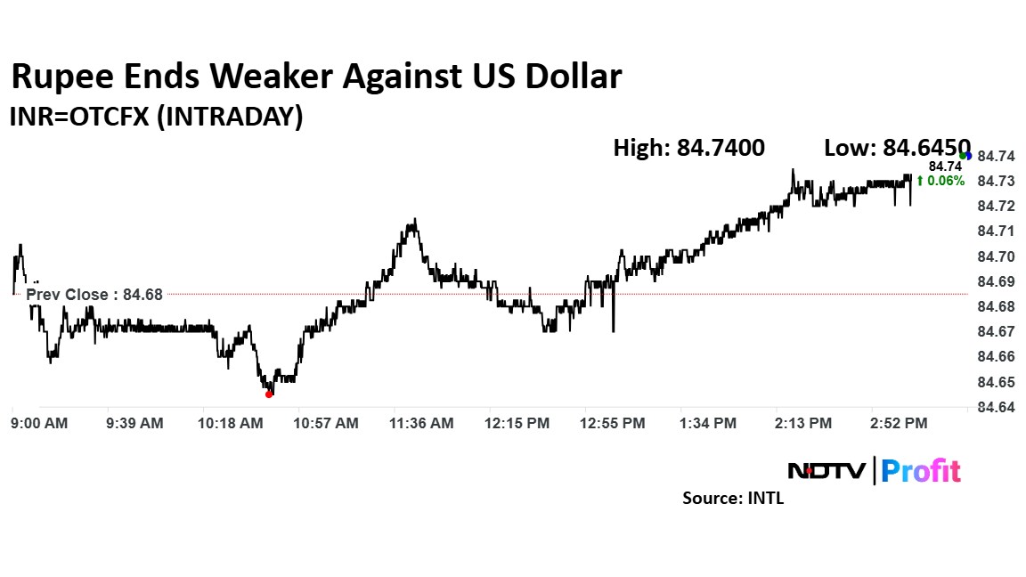 The domestic currency weakened by four paise to close at 84.73 against the US dollar, according to Bloomberg data. The rupee had closed at 84.69 against the greenback on Tuesday.