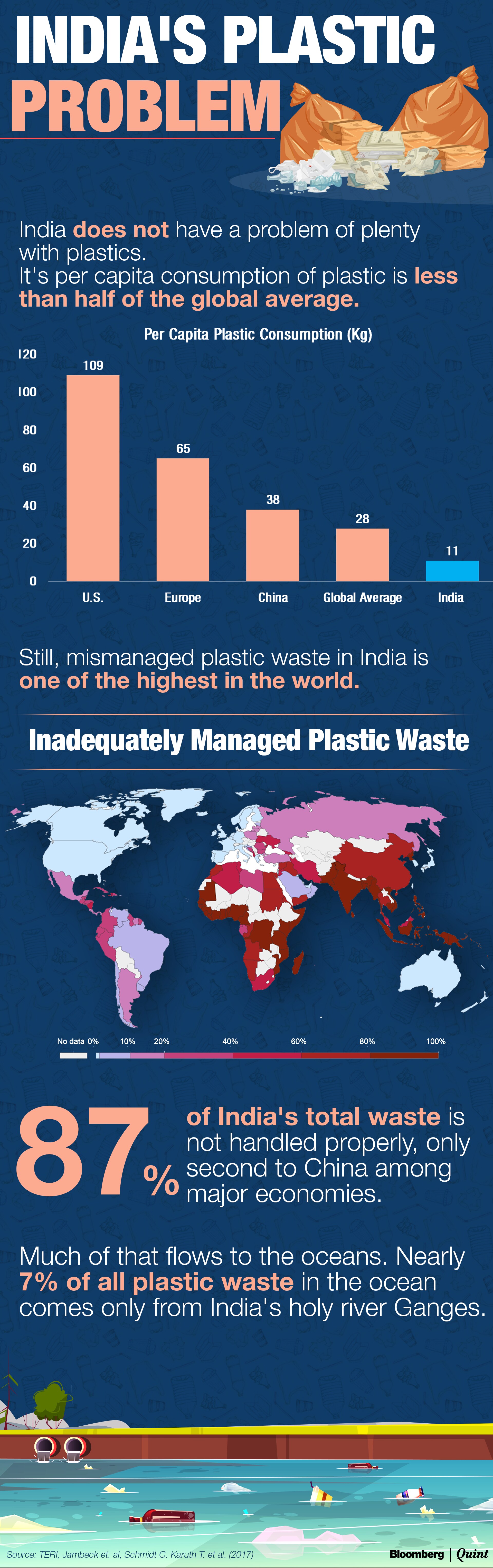 Every day, India generates plastic waste that weighs as much as 150 large blue whales—the biggest animal known to exist. The problem though is not the volume of plastic waste it generates but the disposal of it. An average Indian consumes almost ten times less plastic than an average American. According to The Energy and Resources Institute, India's per capita consumption of plastic is less than half of the global average.