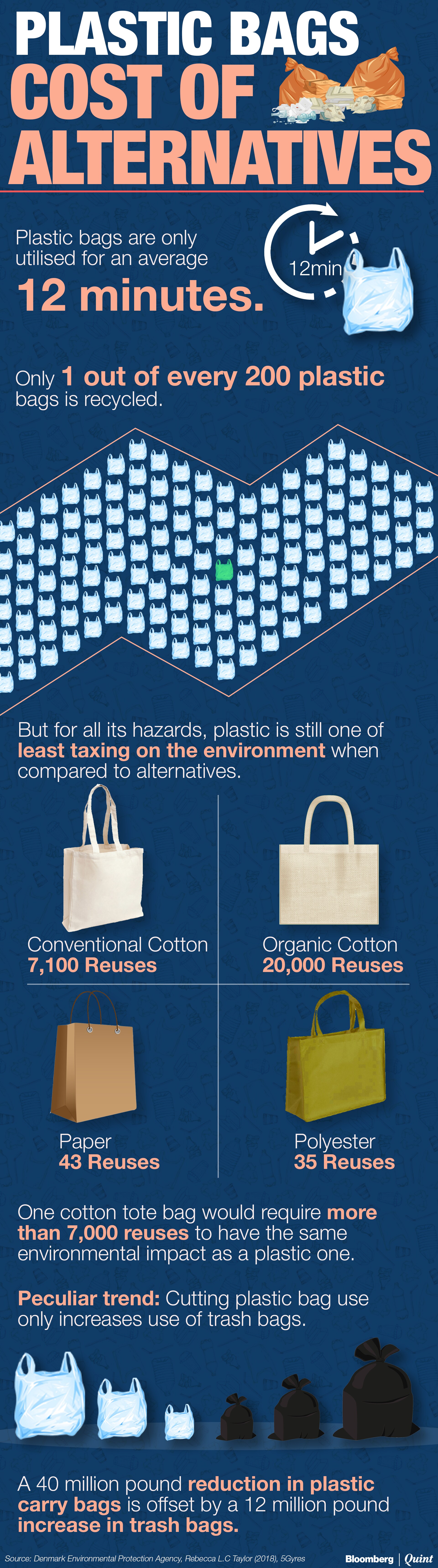 And Danish researchers realised it when they compared plastic bags to other alternatives. Take cotton bags for instance. Factoring in the water and energy used in production, you'd have to reuse a single cotton bag more than 7,000 times to have the same environmental impact as a polythene bag, according to a study by the Denmark's environment protection agency. The study does not account for the fact that a cotton tote will biodegrade within 5 months while plastic would take centuries.