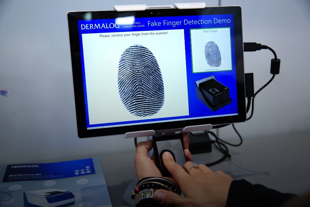 An exhibitor uses a fingerprint scanning device as part of a fake finger detection demonstration in Hannover, Germany. (Photographer: Krisztian Bocsi/Bloomberg)