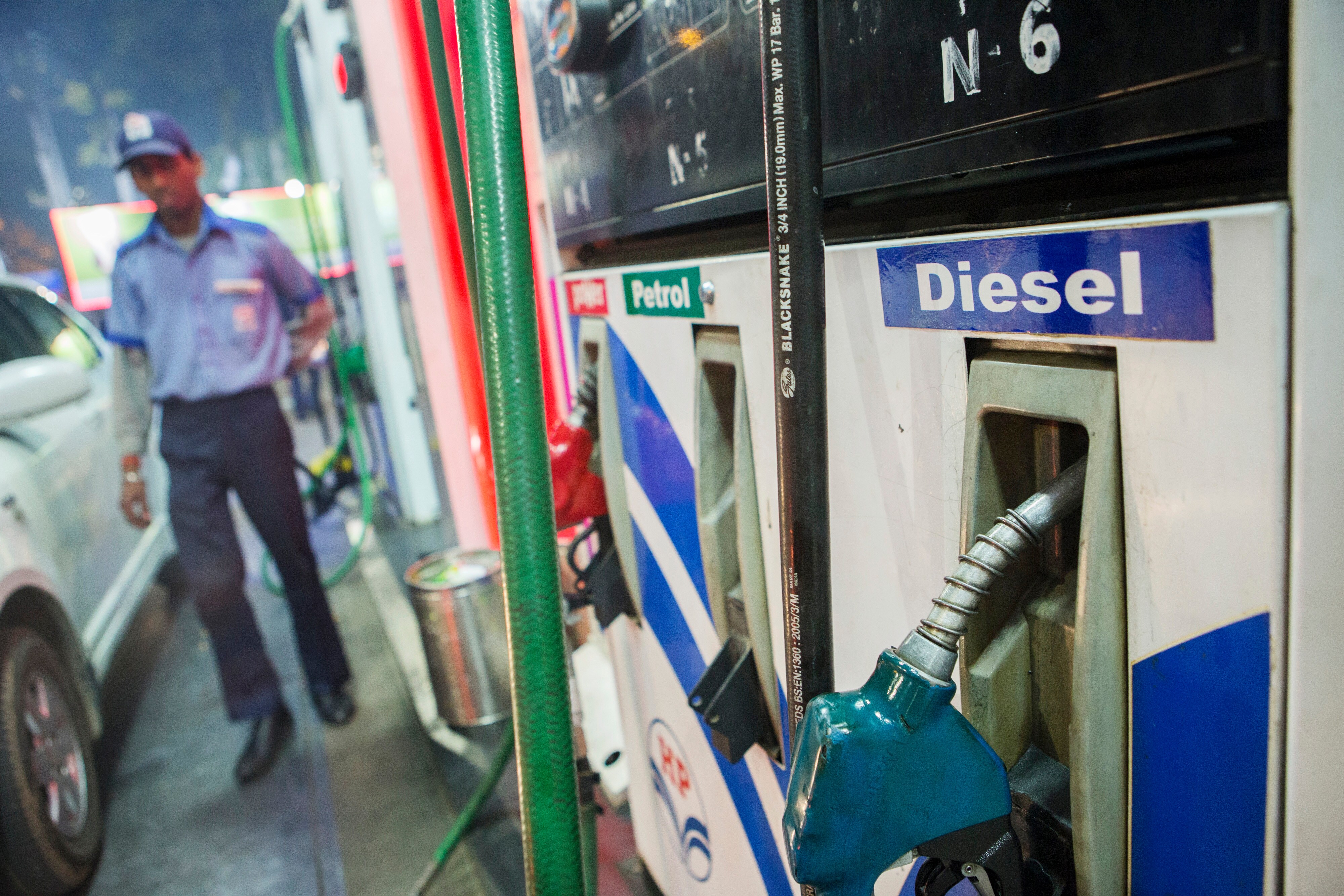 Diesel and petrol gas pumps stand at a gas station in New Delhi. (Photographer: Prashanth Vishwanathan/Bloomberg)
