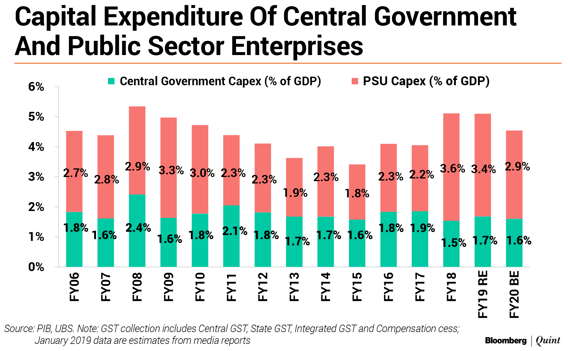 The government's budgeted capital expenditure “deteriorated” for FY20 in comparison to last year, the UBS report said. Even the government's off-balance sheet funding by public sector enterprises on capex is estimated to slow down to 2.9 percent of GDP in FY20 versus 3.4 percent in the last year.