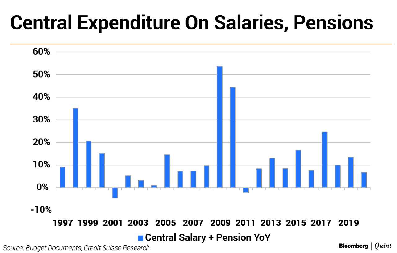 A lower-than-usual hike in salaries of central government employees under the Seventh Pay Commission is likely to provide some fiscal space, Credit Suisse report said. There was a 7 percent year-on-year growth in the budgeted expenditure for FY20.