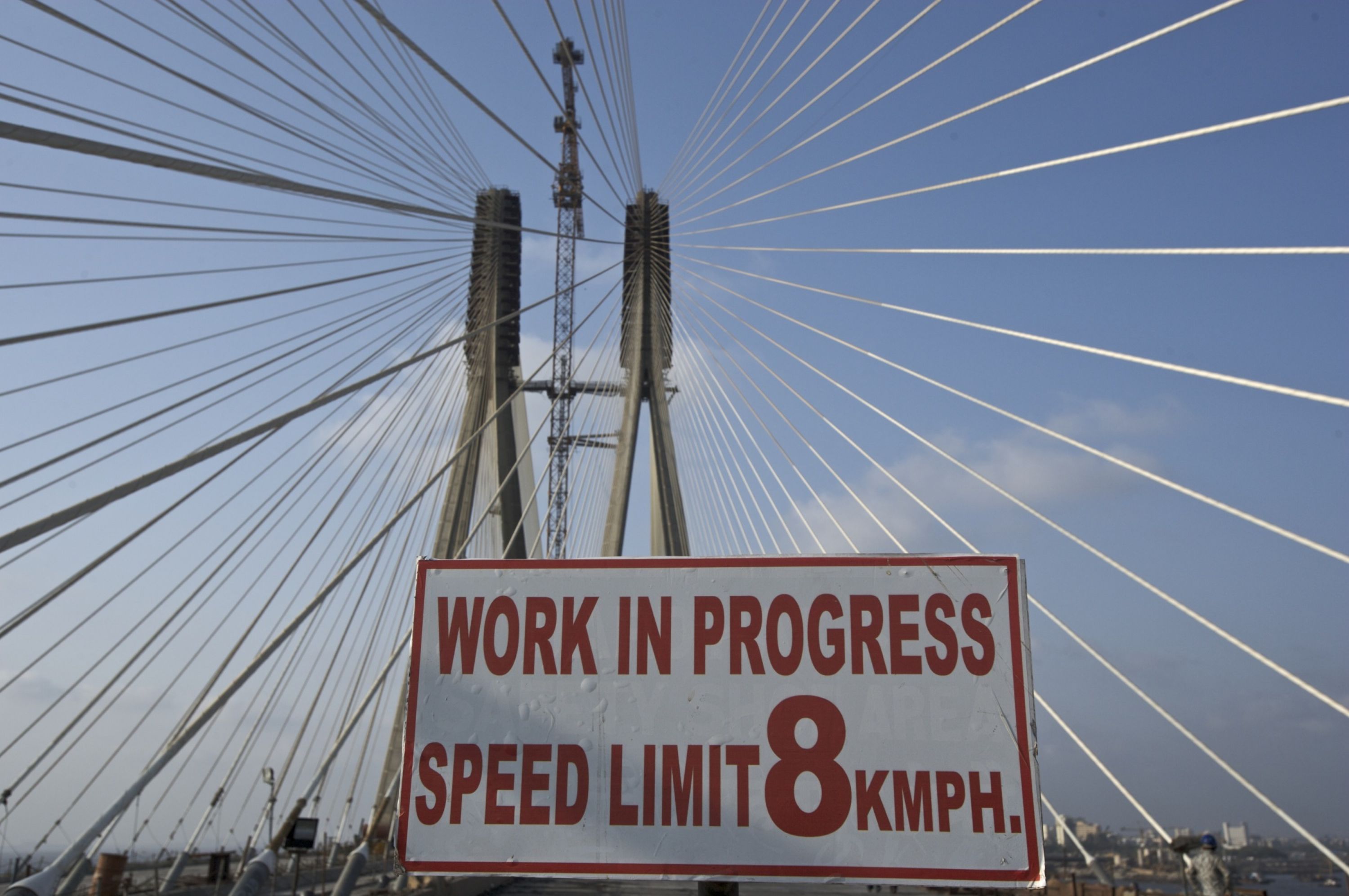 A work in progress board is installed at the Bandra-Worli sea link in Mumbai, India, on Tuesday, May 5, 2009. Photographer: Adeel Halim/Bloomberg News