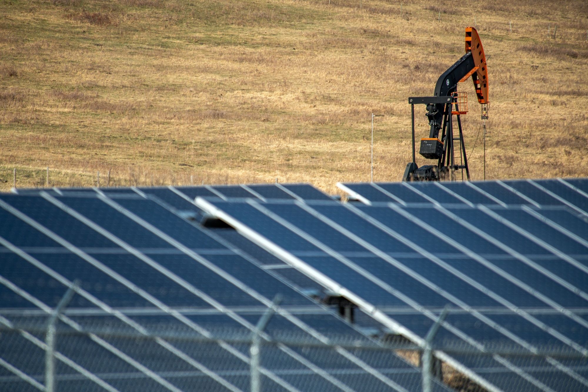 An oil pumpjack behind a bank of solar panels near Longview, Alberta, Canada, on Tuesday, April 26, 2022. Prime Minister Justin Trudeau’s government wants a 42% reduction in emissions from the oil and gas sector as part of Canada’s plan to meet its 2030 emissions-reduction goal.