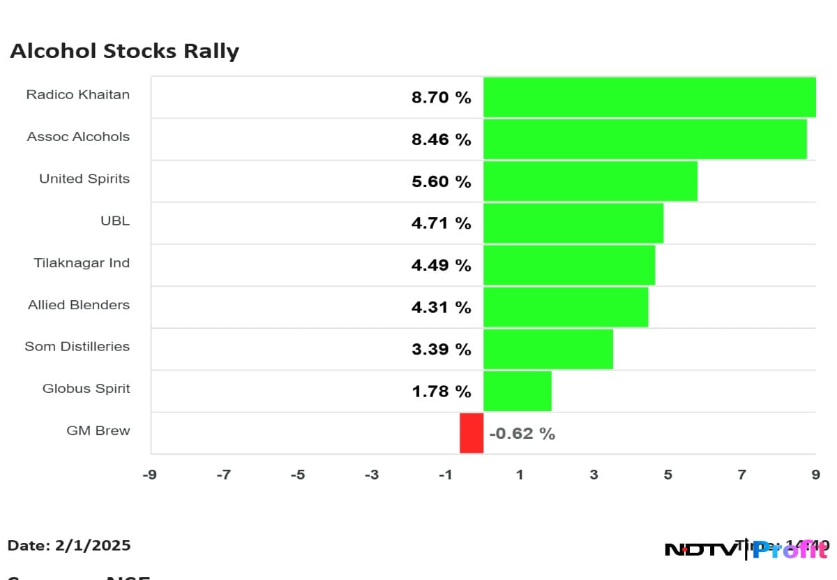 Shares of United Spirits, Radico Khaitan, United Breweries, Som Distilleries, and Allied Blenders and Distilleries jumped on Saturday, after the Centre made no mentions of the anticipated hike in the tax for the alcohol industry in the Union Budget 2025–26.