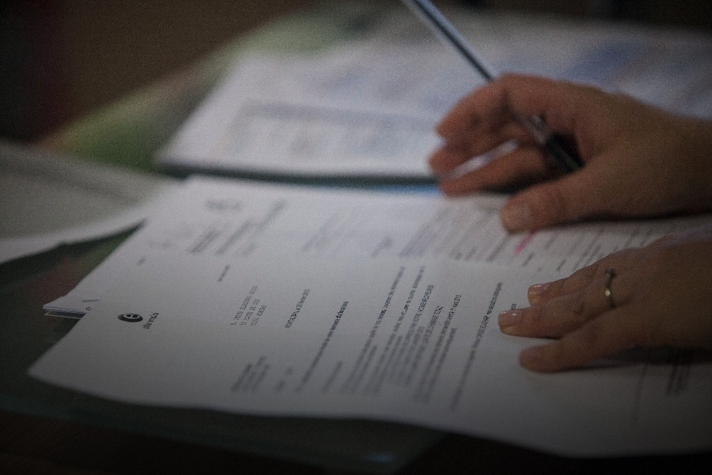An employee checks documents (Photographer: Balint Porneczi/Bloomberg)