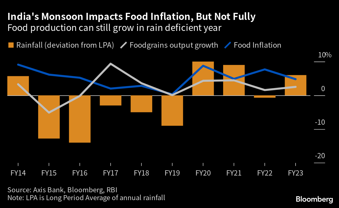 Below-normal rains in India often prompts the government to start work on drought-relief and take steps to prevent a spike in food prices by restricting exports of agricultural commodities and ramping up imports of edible oils. Saugata Bhattacharya, an economist with Axis Bank, said such measures would help with food prices rather than just relying on monetary policy.