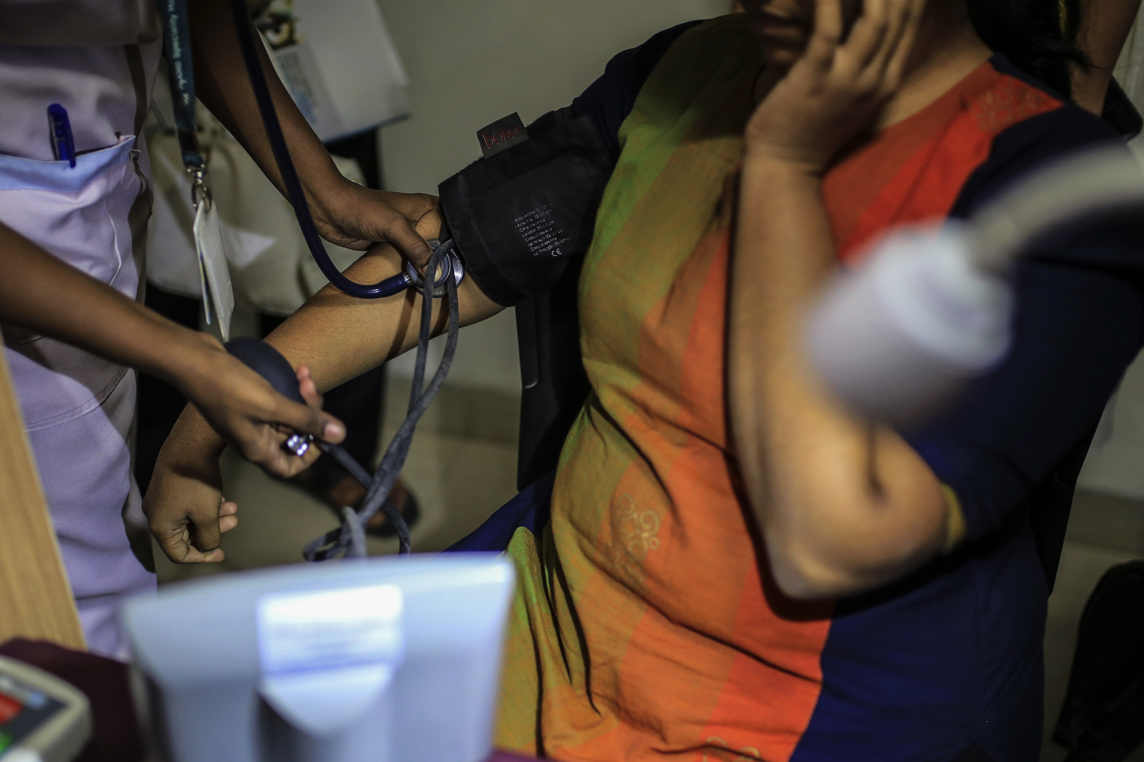 A nurse uses a stethoscope while attending to a patient in a pathology lab in the Vanagaram area of Chennai, India. (Photographer: Dhiraj Singh/Bloomberg)