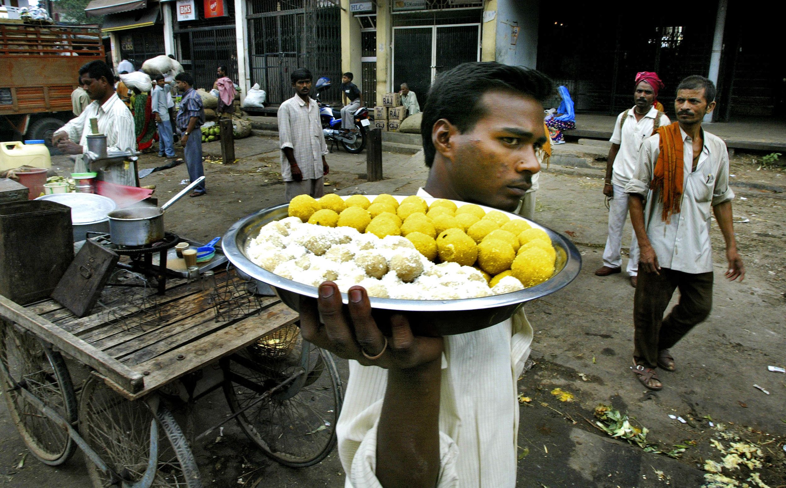 A vendor sells ladoo, a local sweet, in the Azadpur Wholesale Fruit and Vegetable Market in New Delhi, India. (Photographer: Amit Bhargava/Bloomberg News)