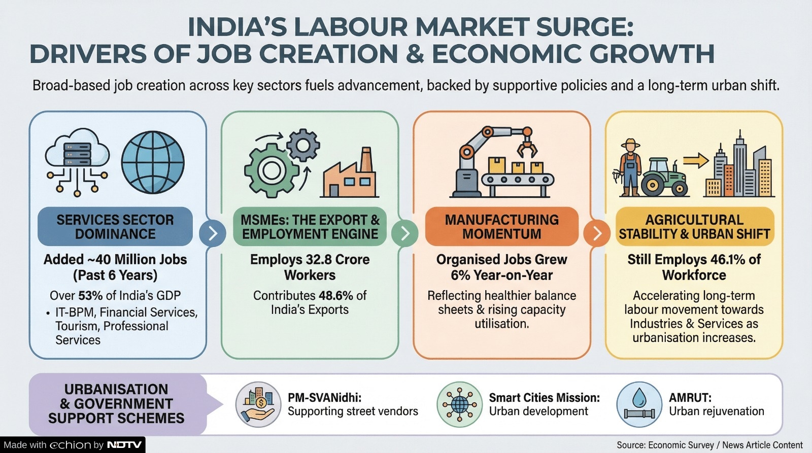 India's labour market is showing clear signs of strengthening with unemployment declining and workforce participation rising, according to the Economic Survey 2025-26 tabled on Thursday. The Survey also highlights that employment conditions have improved steadily through FY26, mostly supported by structural reforms, rising formalisation of the sector, and stronger economic activity. READ FULL STORY HERE