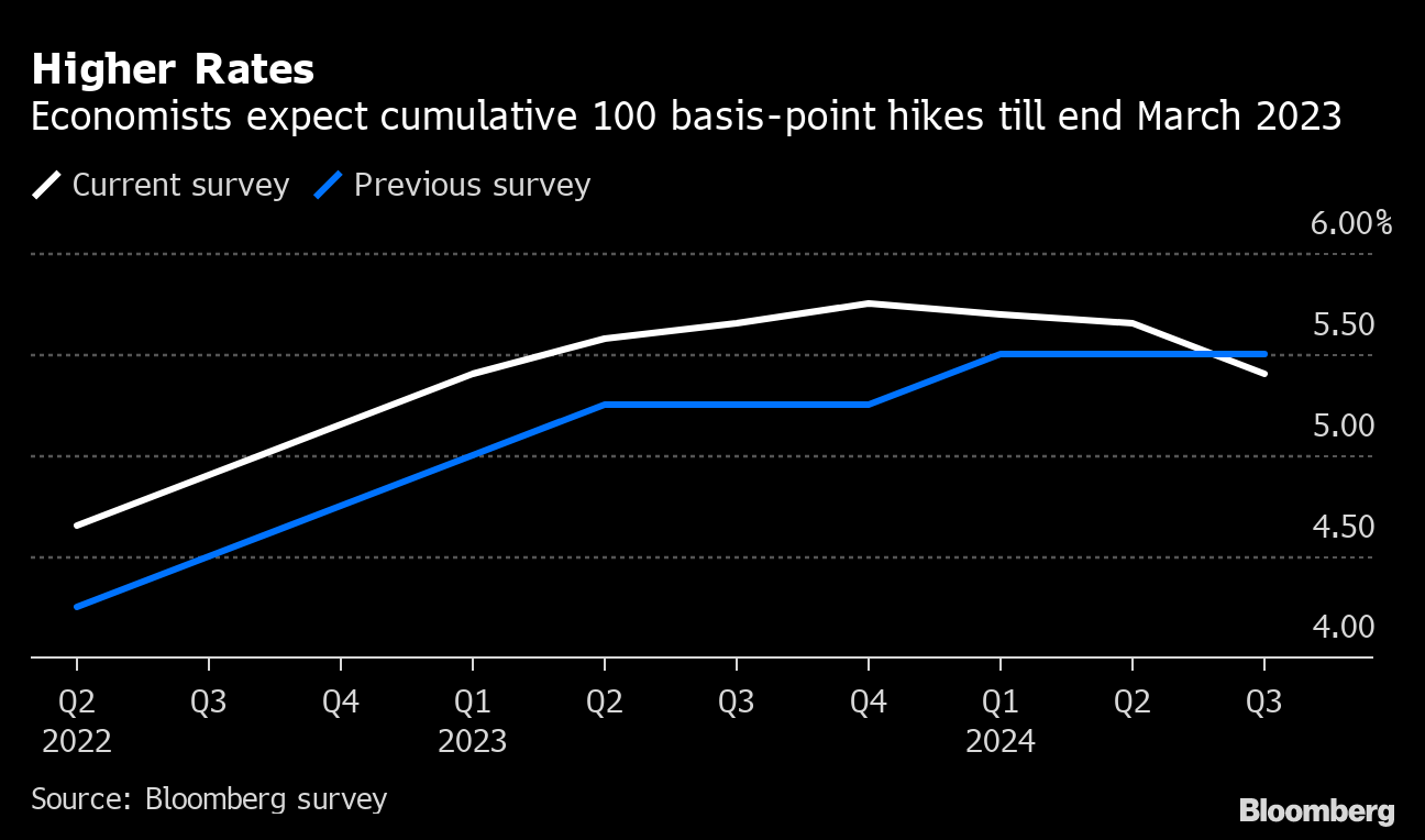 The benchmark repurchase rate is expected to climb to 5.40% in four quarter-point moves during the period, according to the median estimate in the survey. The analysts see the rate further rising to 5.75% through December 2023, or 50 basis points higher than previously expected.