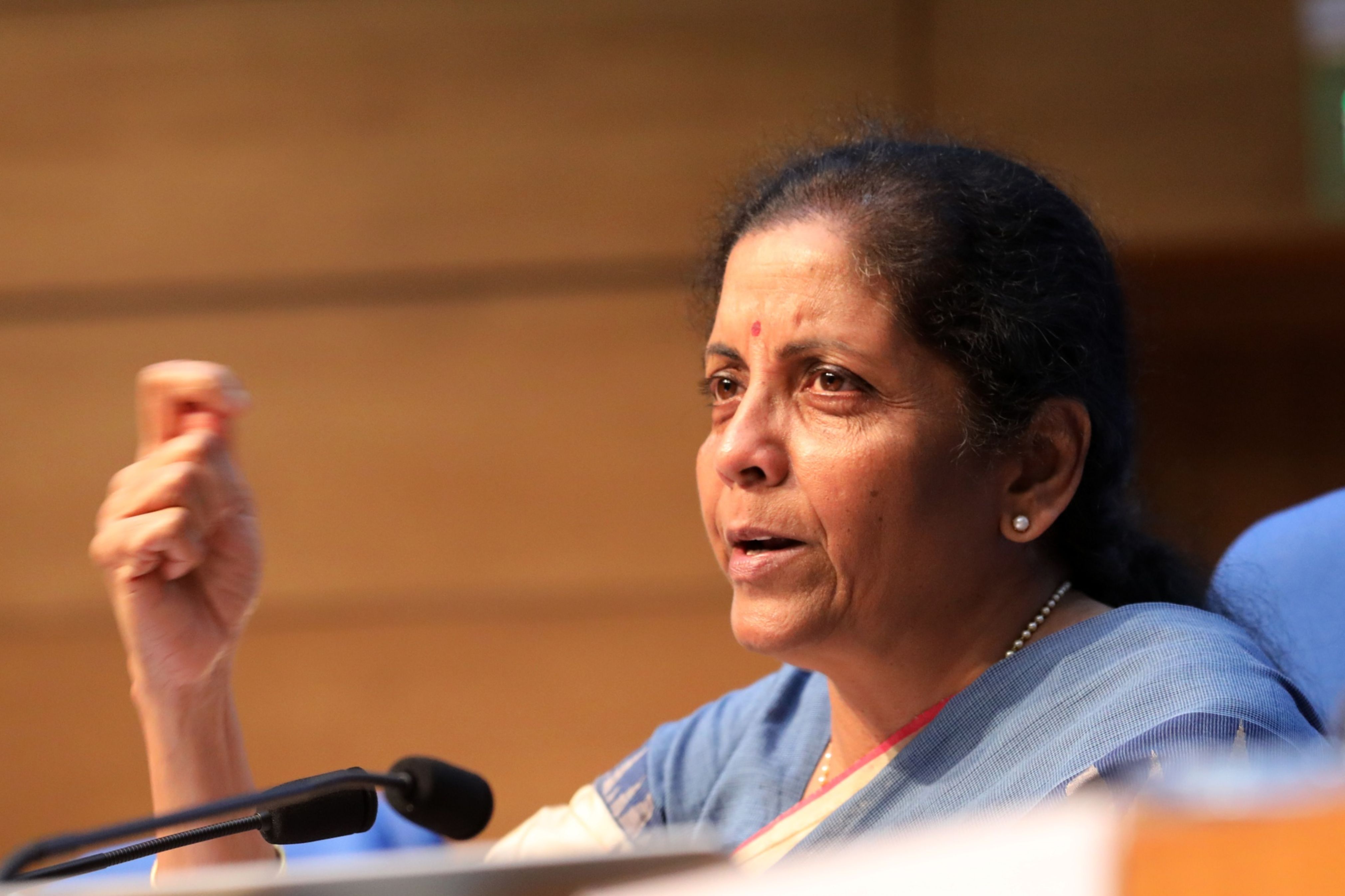 Nirmala Sitharaman, India’s finance minister, speaks during a news conference in New Delhi, India. (Photographer: T. Narayan/Bloomberg)