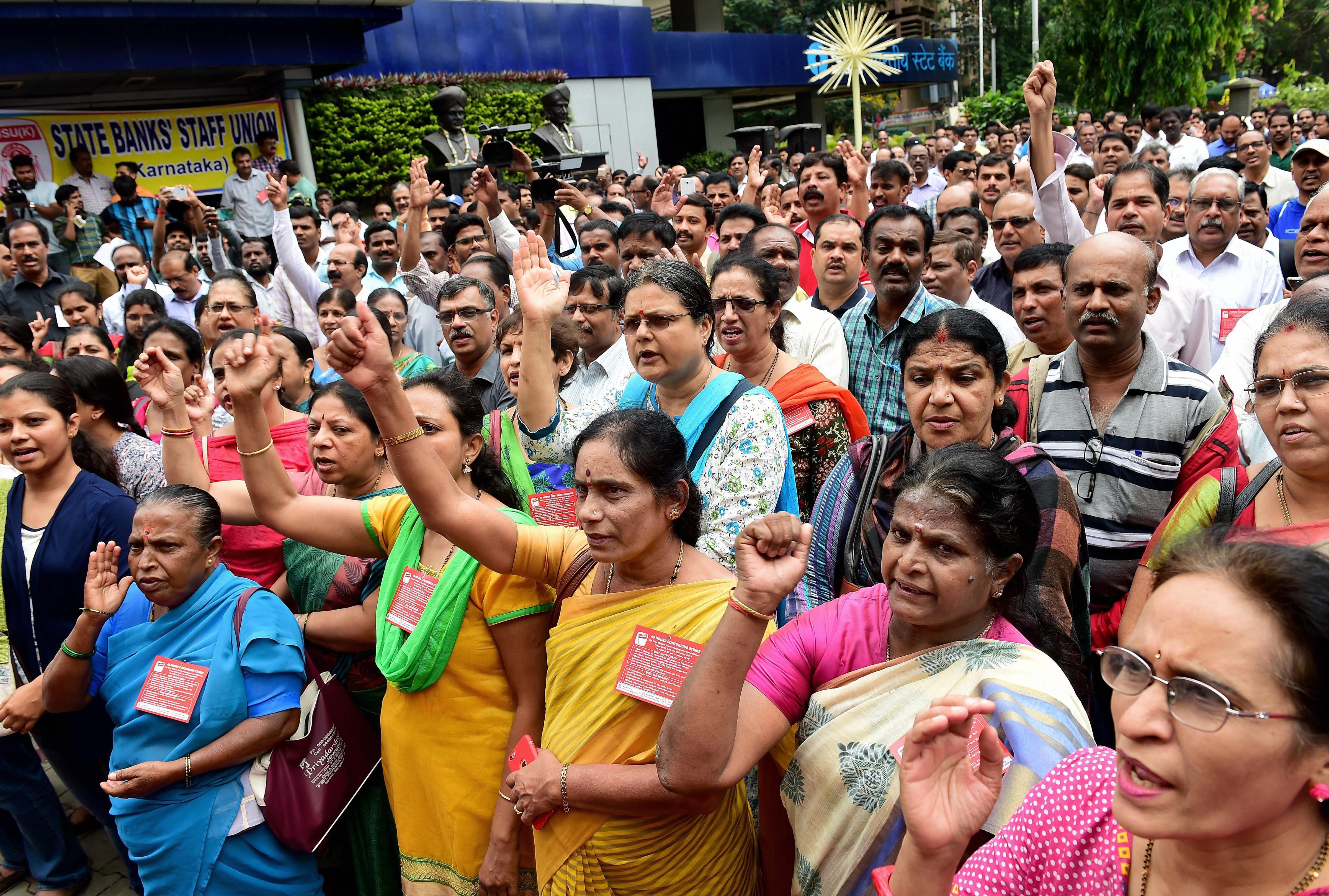 File photo of bank employees shout slogans as they hold a demonstration as part of their two-day nationwide strike to press for wage revision, in Bengaluru. (Source: PTI)