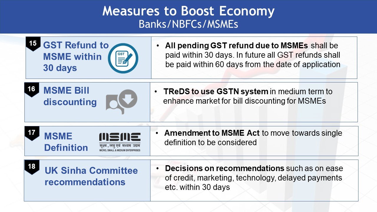 All pending GST refunds due to micro, small and medium enterprises (MSMEs) to be paid within 30 days, said the Finance Ministry. Future refunds will be paid in 60 days. This in an effort to ease liquidity and cash flow for small businesses.