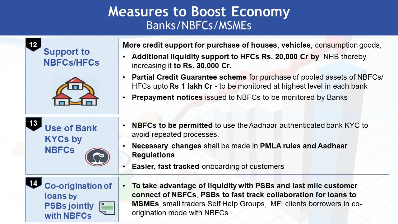 The Finance Minister announced that the additional liquidity support for HFCs will be raised to Rs 30,000 crore from NHB versus the earlier announced Rs 20,000 crore.