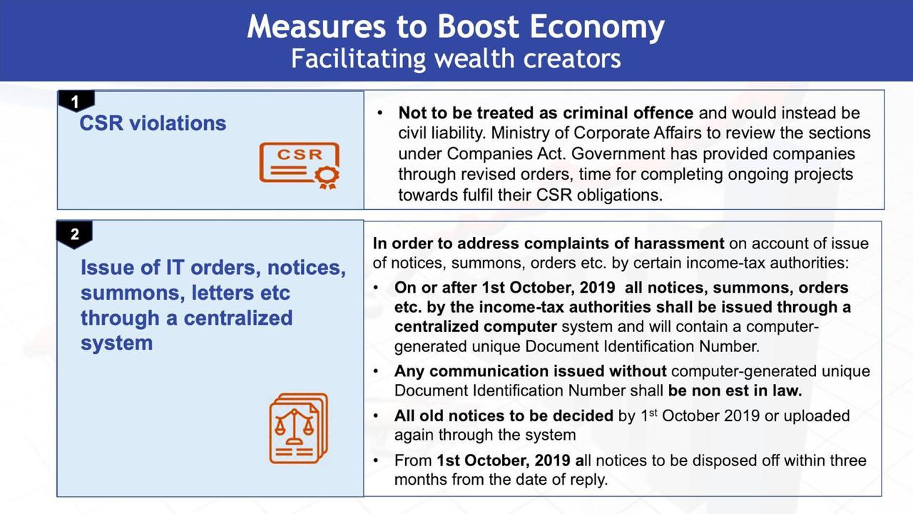 Finance Minister Nirmala Sitharaman made an hour-long presentation on Friday evening, listing measures announced and to be take in the future to help the economy overcome a global slowdown. The announcements ranged from equity markets to auto sector to MSMEs.