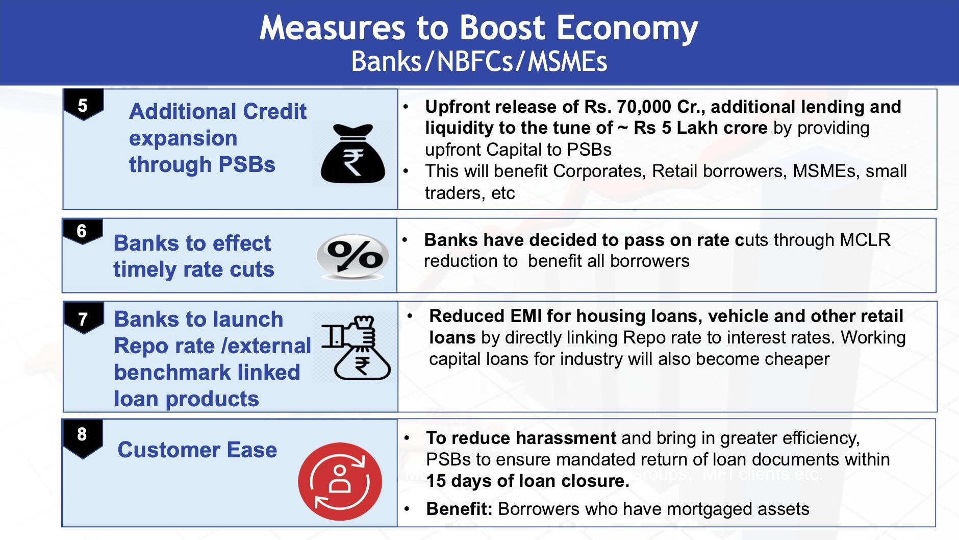 The Finance Minister said that banks have agreed to pass on interest rate cuts announced so far by the Reserve Bank of India. Banks have also agreed to move to external benchmarking of rates, linking them to the repo rate.