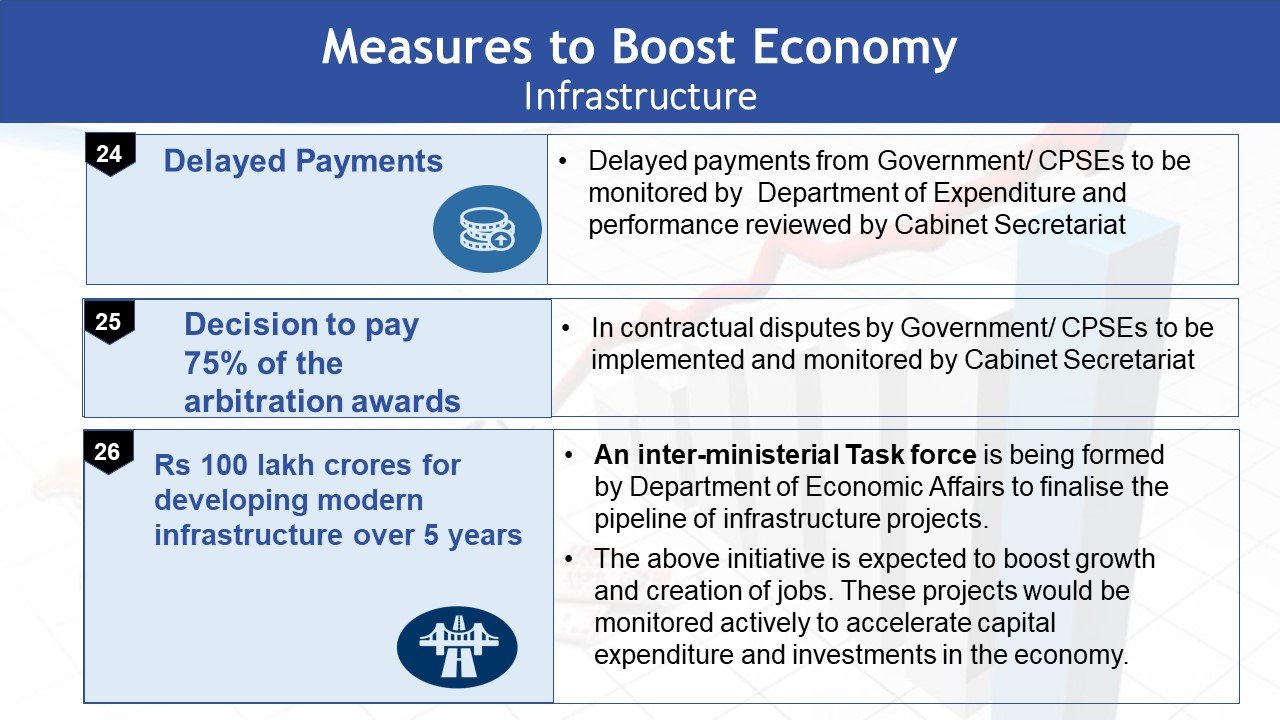 Several vendors and contractors working with the government and public sector units have often complained of pending payments. Many of these payments are often stuck in arbitration, in cases of cost overruns or other disputes. The Finance Minister said delayed payments from govt/CPSEs will be closely monitored.