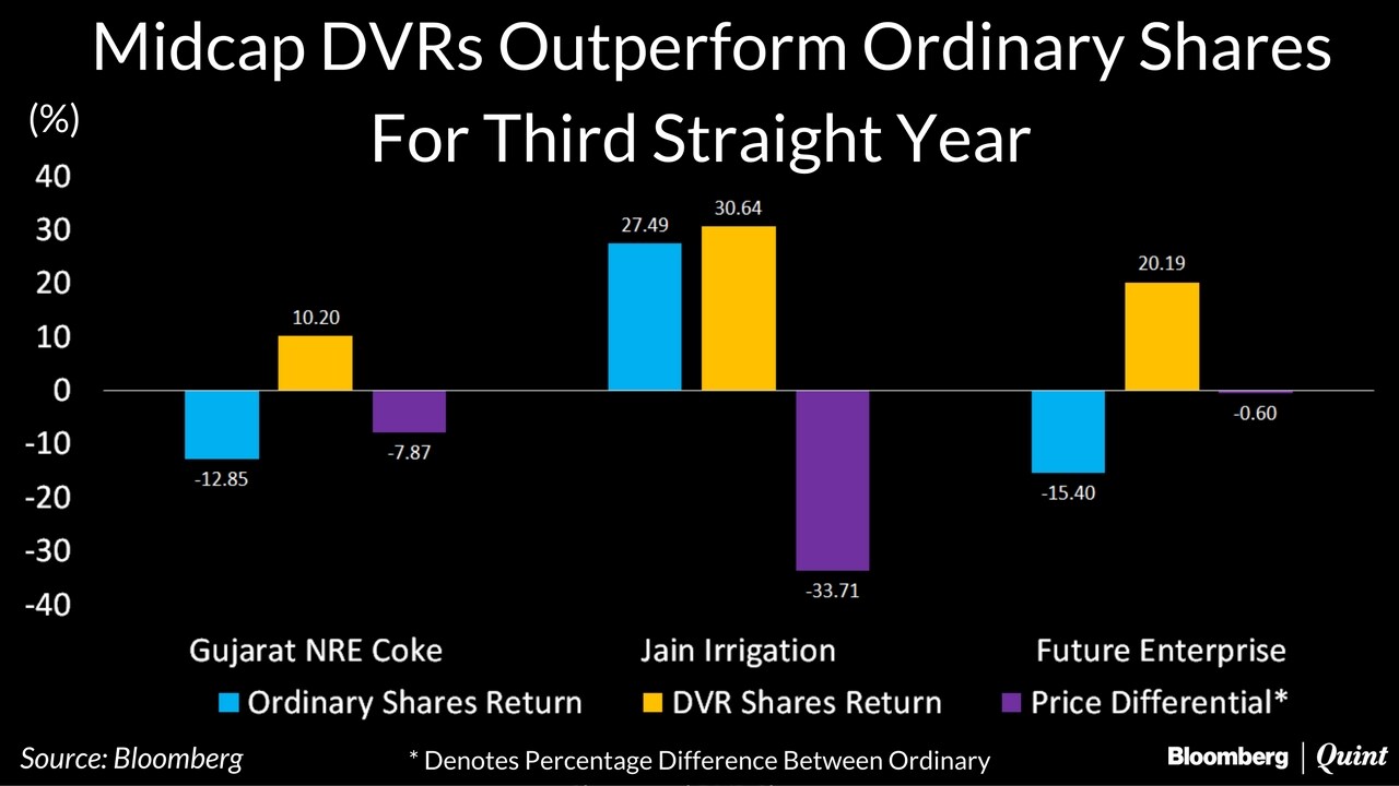 Shares with differential voting rights, or DVRs, of three midcap companies have outperformed their respective ordinary shares in 2016. For the third consecutive year, DVRs of Future Enterprises, Gujarat NRE Coke and Jain Irrigation have churned out better returns than their ordinary shares.