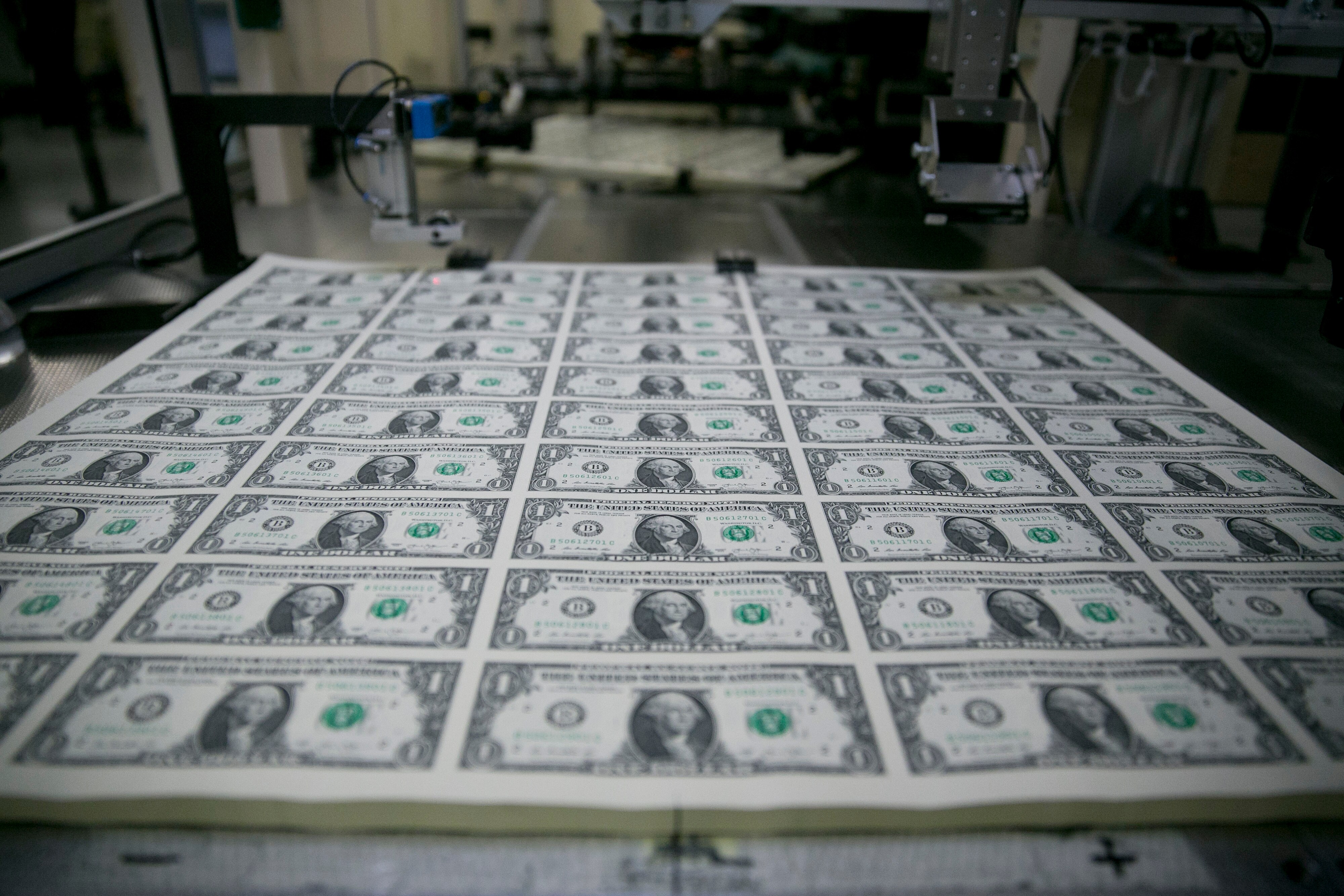 Stacks of 50 subject one dollar note sheets pass through a KBA-NotaSys SA large examining printing equipment machine after receiving a serial number and the U.S. Treasury and U.S. Federal Reserve seals at the U.S. Bureau of Engraving and Printing in Washington, D.C., U.S. (Photographer: Andrew Harrer/Bloomberg)