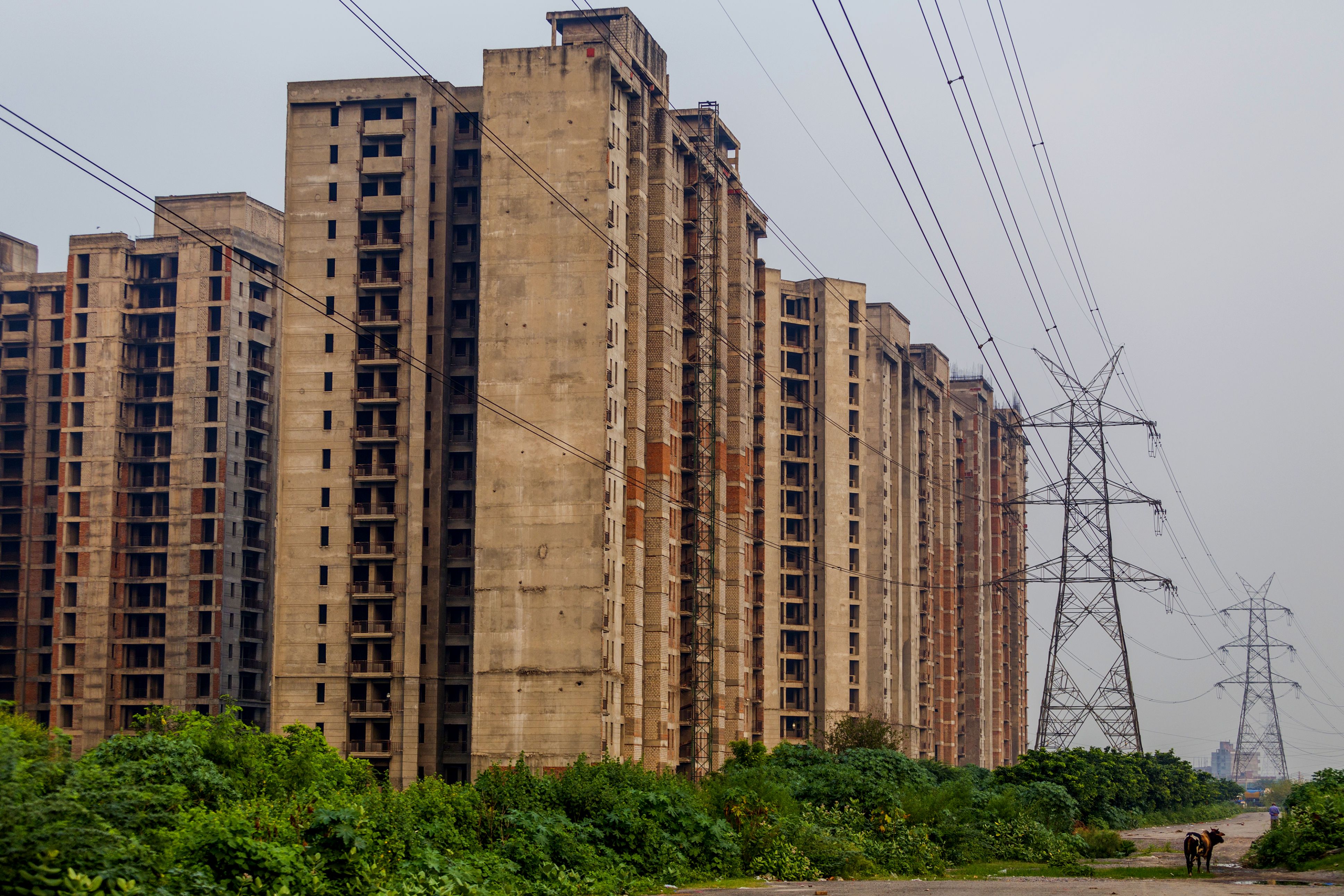 Electricity pylons stand near to residential buildings under construction (Photographer: Prashanth Vishwanathan/Bloomberg)