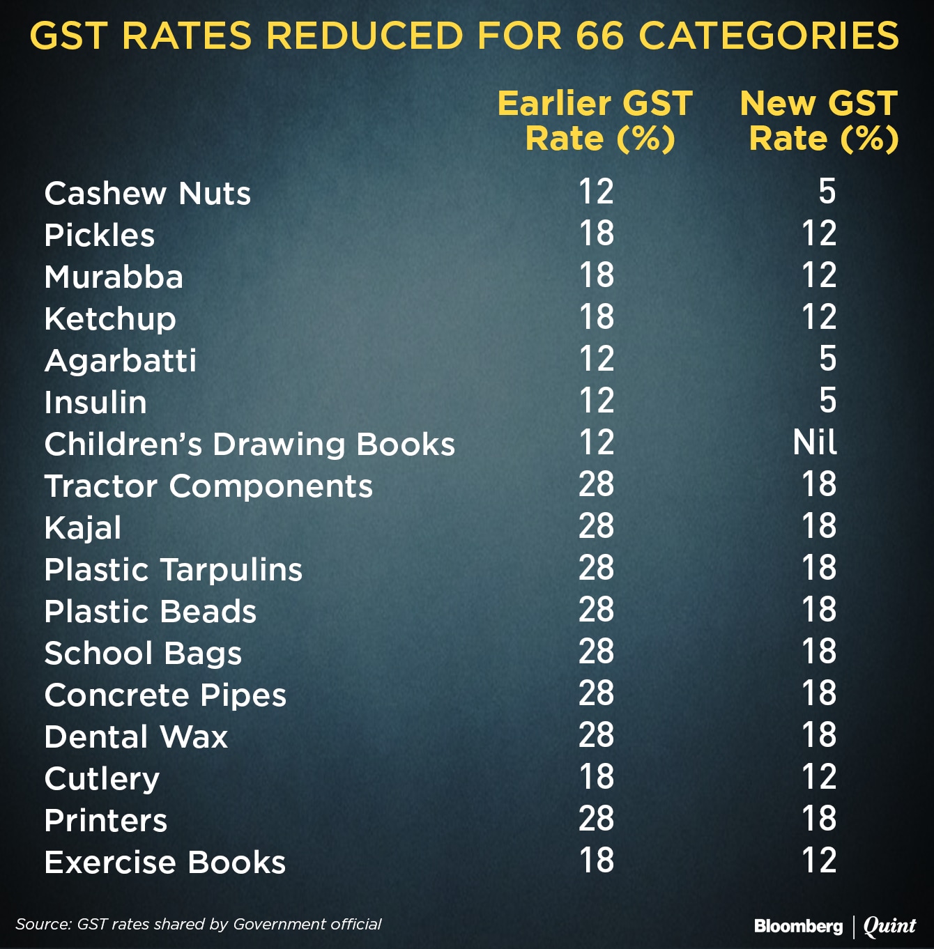 The GST rate on cashew nuts, agarbattis and insulin has been reduced from 12 percent to 5 percent.