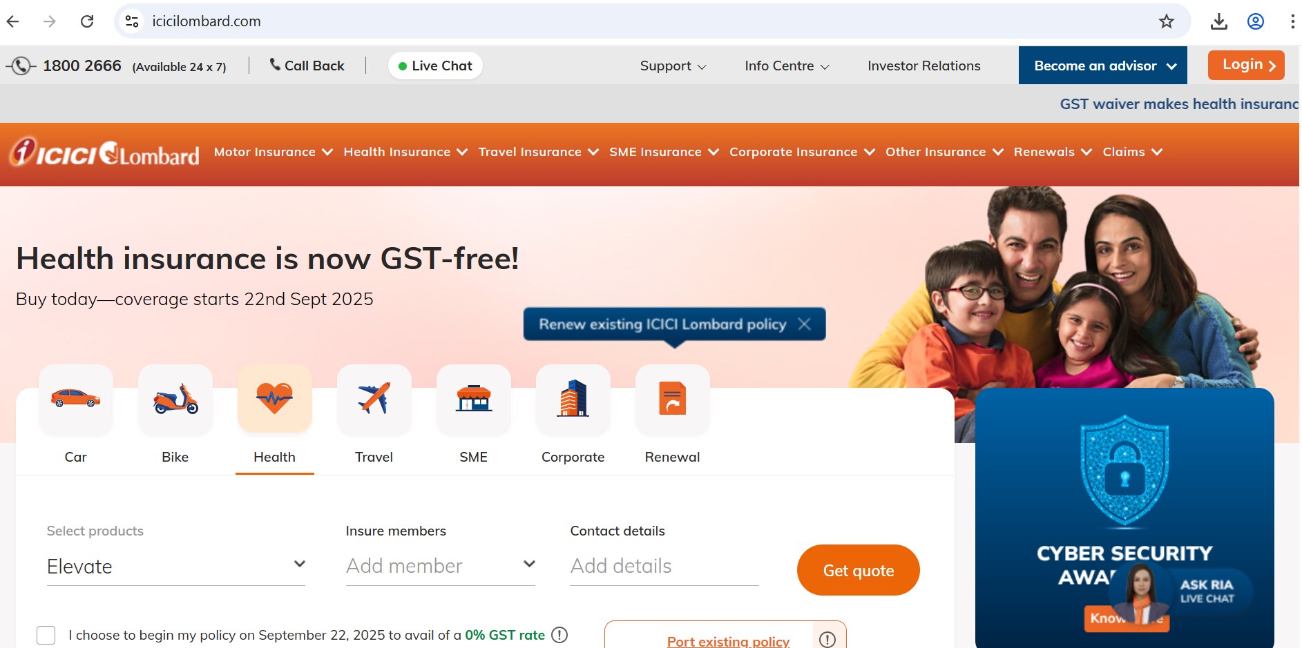 ICICI Lombard's webpage says that health insurance is now GST free. "Buy today- coverage starts September 22." Niva Bupa too exempts GST but states that the policy will start September 22. Tata AIG provides an option to the customer to start the policy from September 22 to avail 0% GST. Aditya Birla Health Insurance portal says that the company is updating their systems to comply with GST rate change to pass on the benefit- You can save 18%, if you choose to start your policy from September 22, 2025, it says.
