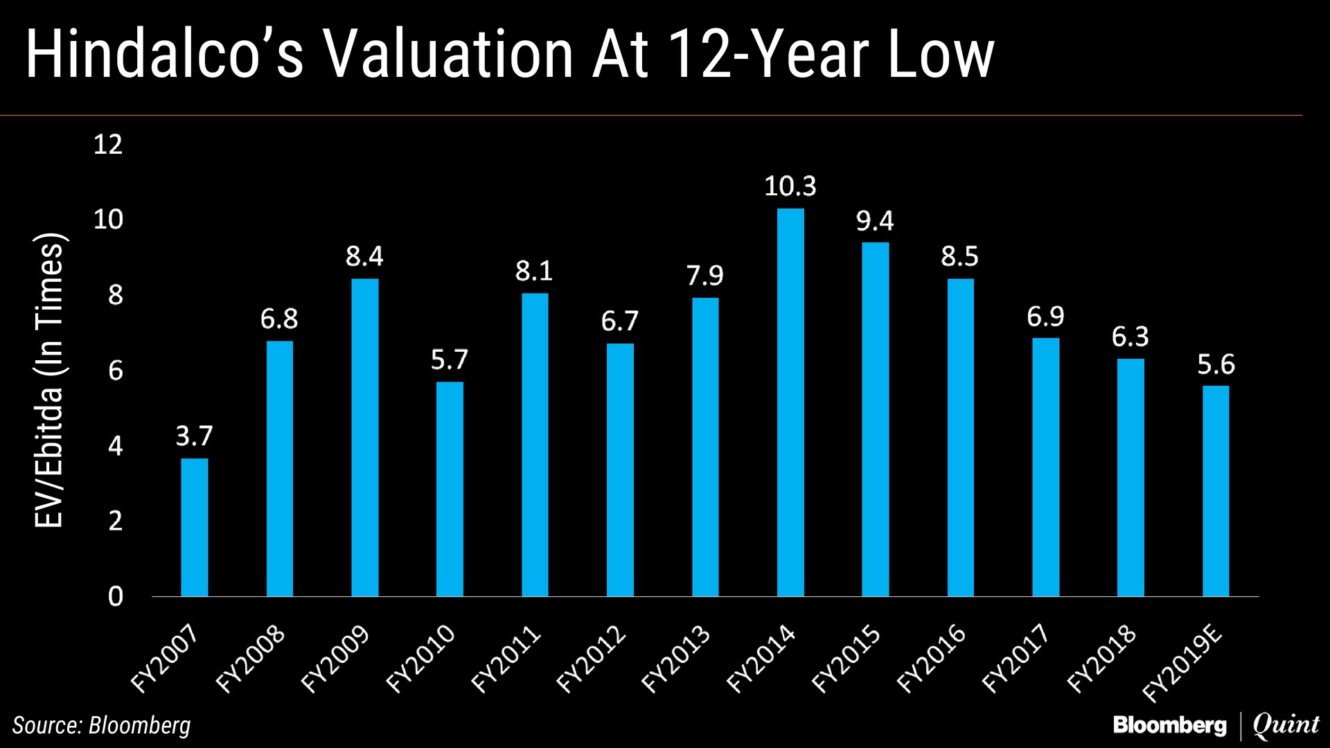 Shares of India's largest aluminium producer have declined 25 percent in 2018 compared with a 20 percent fall in the NSE Nifty Metal Index. It now trades at 5.6 times its estimated enterprise-value-to-Ebitda for FY19, the lowest since FY07 and at a discount of 21 percent to its five-year average.