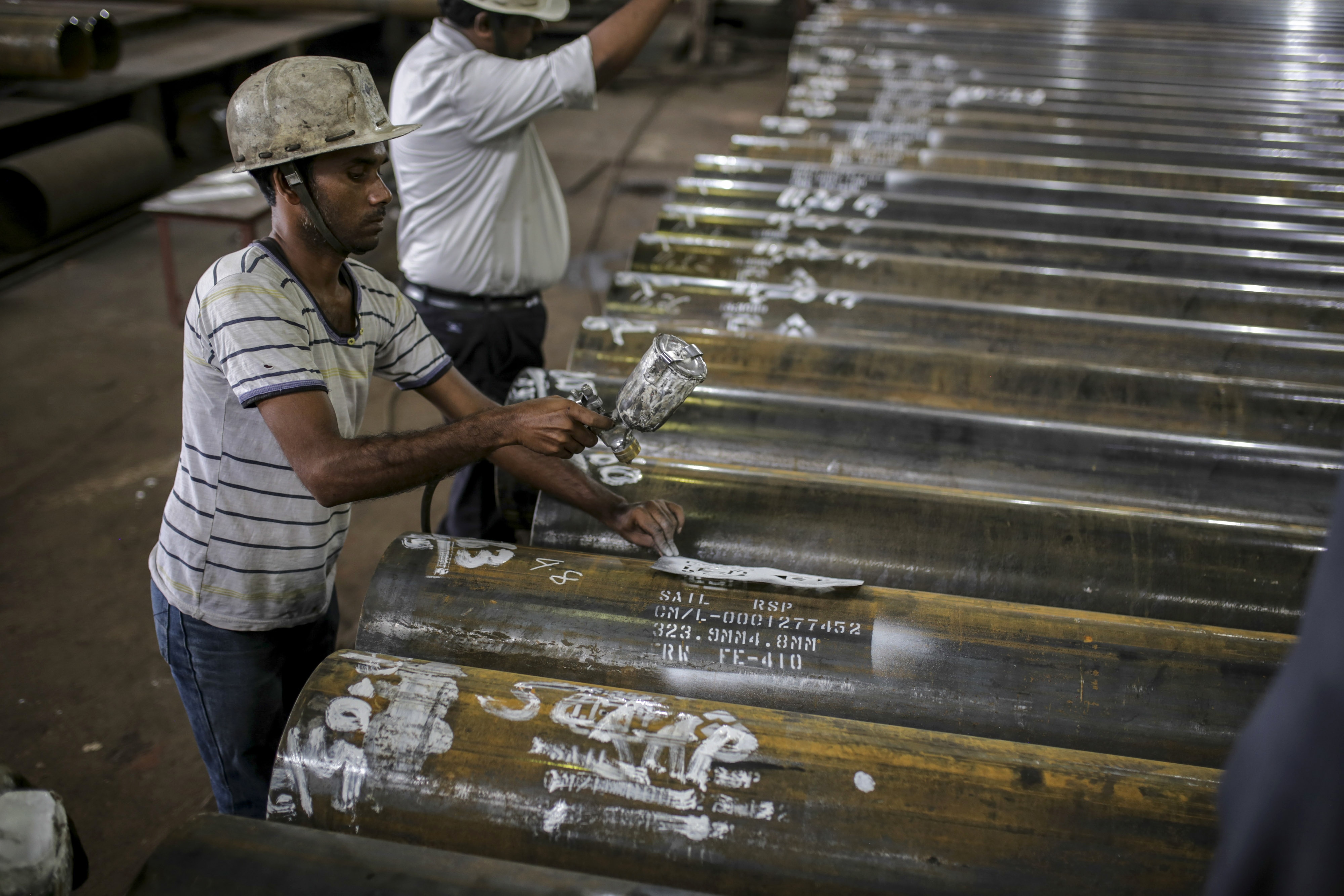 A worker spray paints code numbers onto steel tubes at the finishing line of the steel tube mill at the Steel Authority of India Ltd. (SAIL) Rourkela Steel Plant (RSP) in Rourkela district, Odisha, India, on Friday, June 21, 2019. Photographer: Dhiraj Singh/Bloomberg
