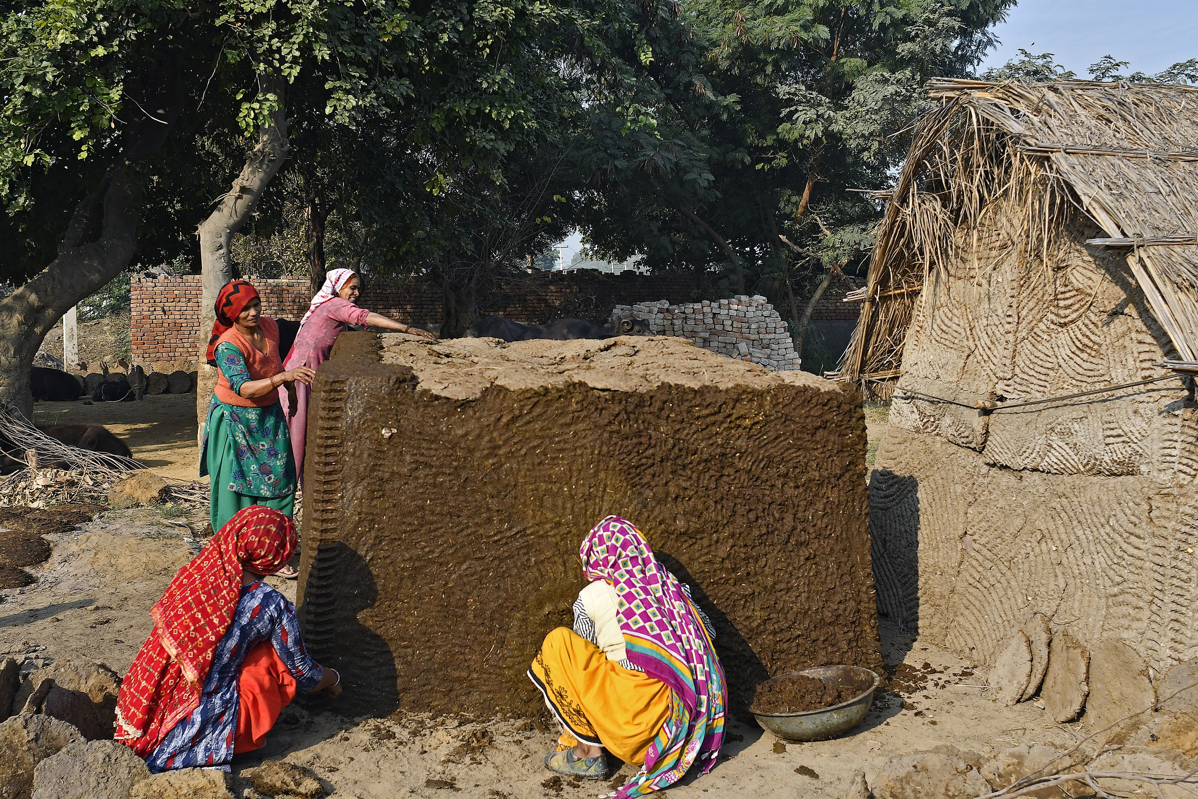 Women build a storage facility for cow-dung cakes at a village in Palwal district, Haryana, India. (Photographer: Anindito Mukherjee/Bloomberg)