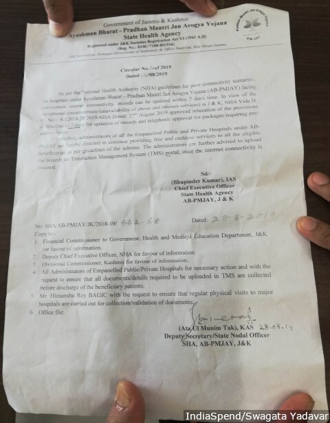 “Due to the lack of internet and phone connectivity, we are unable to provide [free] treatment since the past three weeks,” Akhtar had said previously. “Therefore, I have seen my own patients and other patients spend from their pocket to pay for their dialysis, chemotherapy, etc.” Akhtar's efforts resulted in the August 28, 2019, circular that allowed a relaxation of the seven-day deadline.