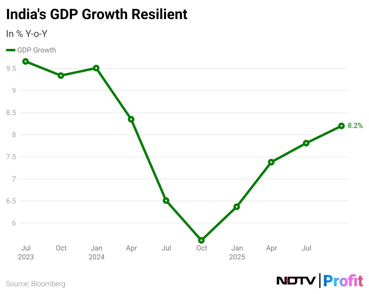 GDP Growth to 8.2% versus 5.4% a year ago. The GDP Growth at 8.2% compared to 7.8% in the first quarter of FY26.