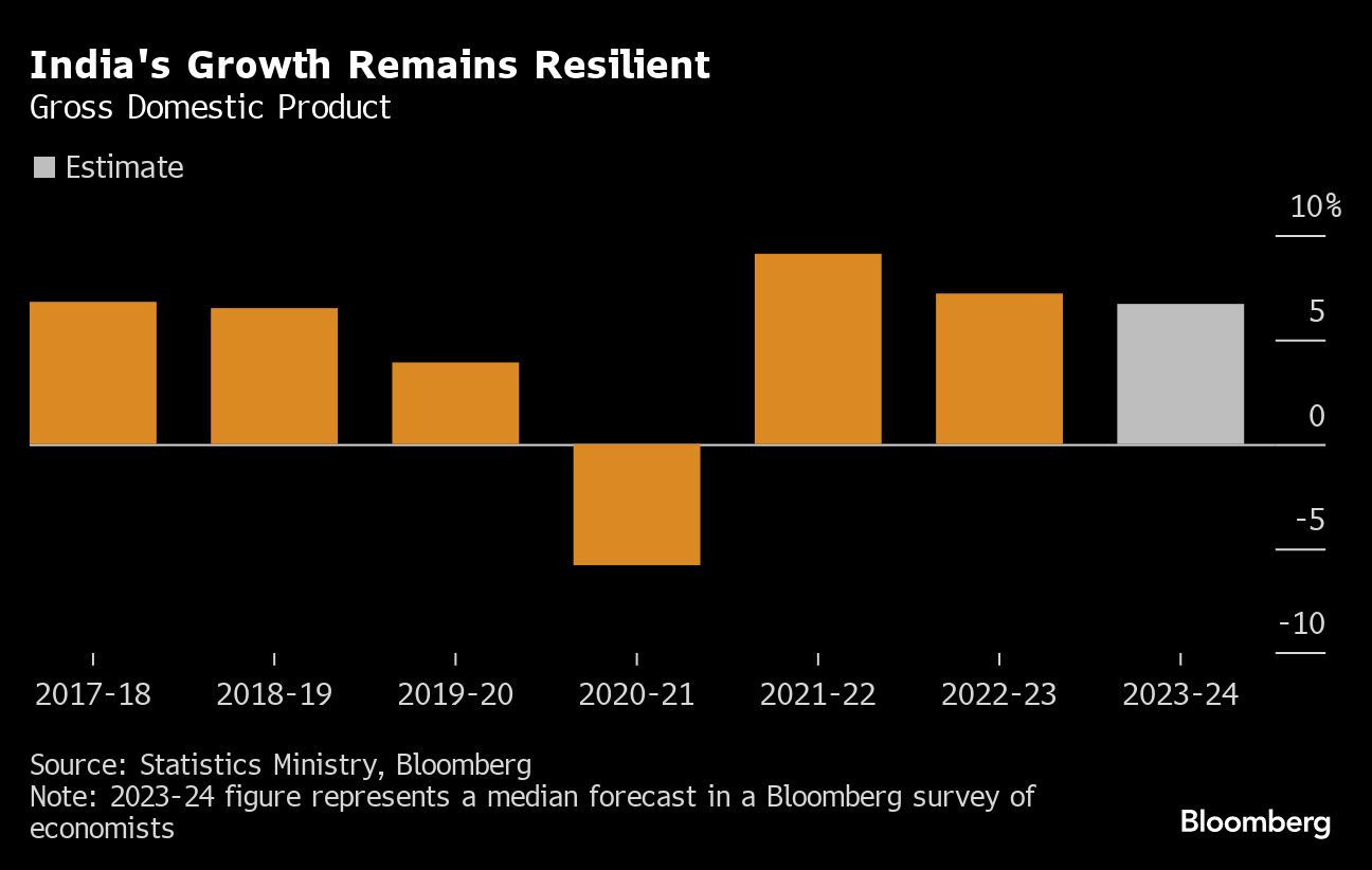 The first official estimate for gross domestic product, due to be released on Friday, will probably be set at 6.7%, according to economists surveyed by Bloomberg. The Reserve Bank of India has already raised its projection for the fiscal year ending March 31 to 7%, while Bloomberg Economics is predicting 7.3% growth.