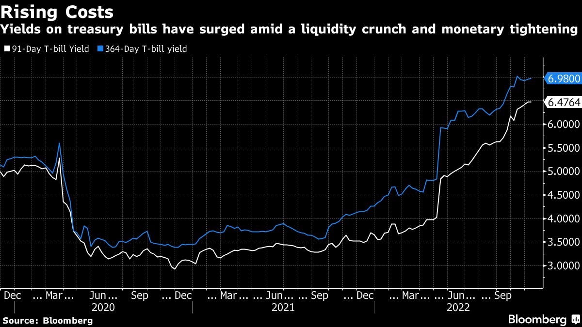 Borrowing costs at treasury-bill auctions have surged to the highest in more than three years amid tight banking liquidity and the recent spate of front-loaded rate hikes by the Reserve Bank of India. The 91-day t-bill yield came at 6.4764% at last week's sale, the highest since May 2019. It is up 264 basis points this fiscal year.