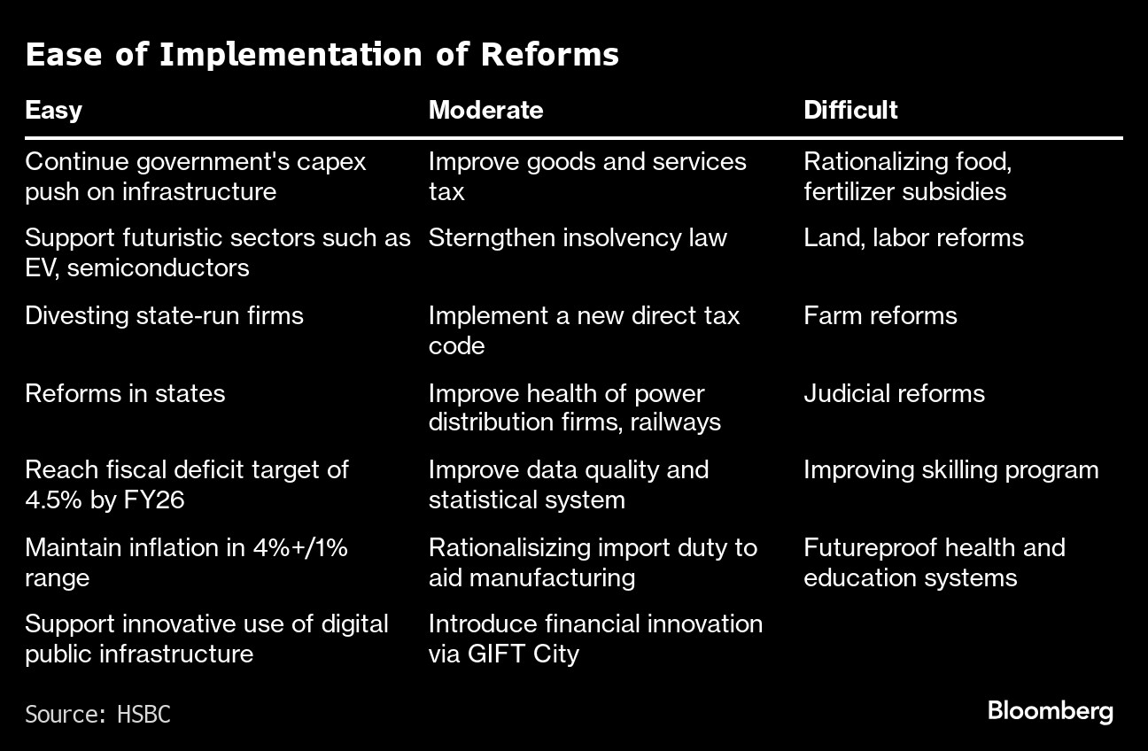 Even with easy to moderate reforms, growth can come in at 6.5% over the medium term, Pranjul Bhandari, HSBC's chief India economy, wrote in a report on India's elections Monday. “For 7.5%+ growth, moderate to hard reforms will be necessary,” she said.