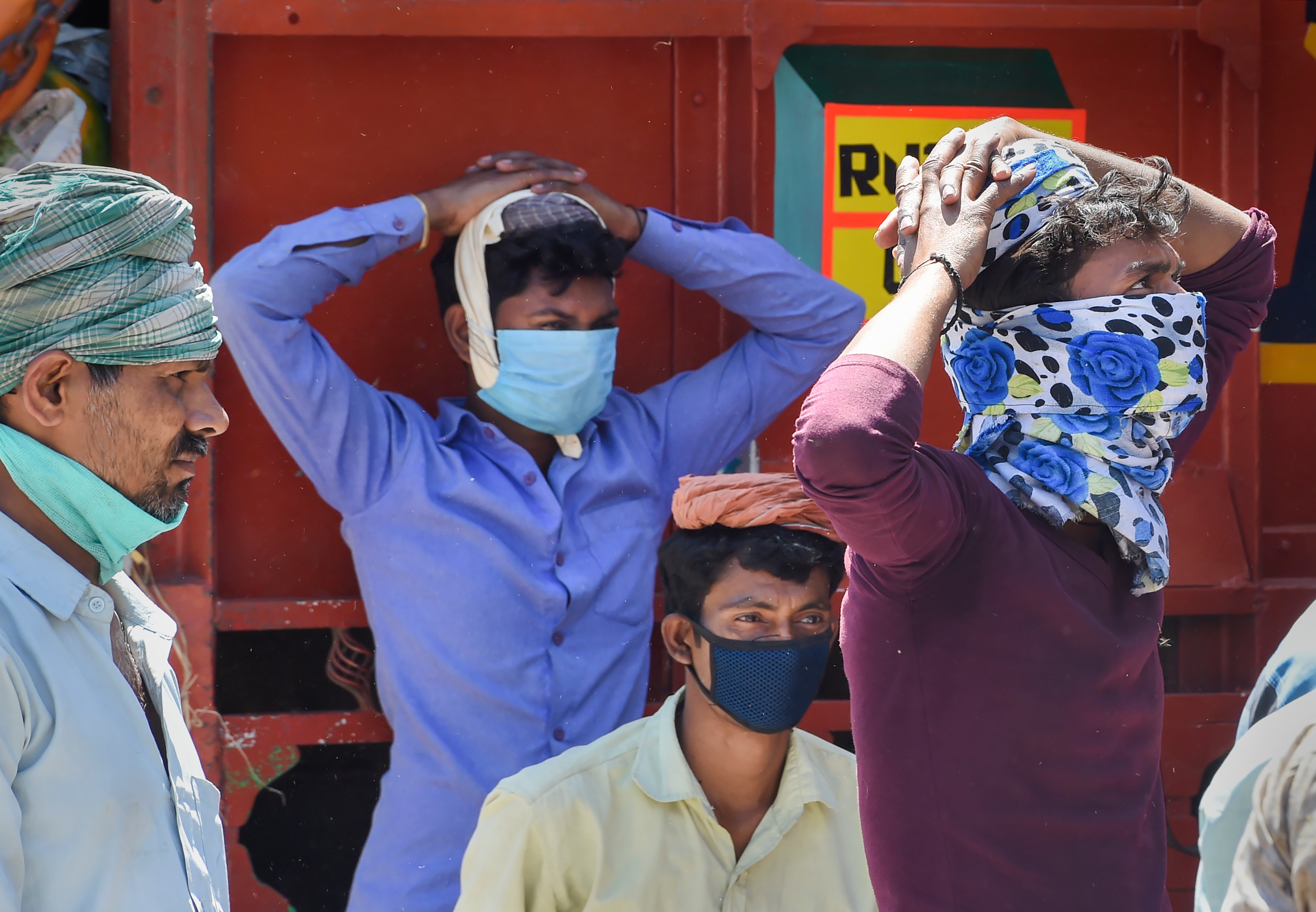 Labourers wait to get work at Azadpur Mandi in New Delhi on April 2, 2020. (Source: PTI)